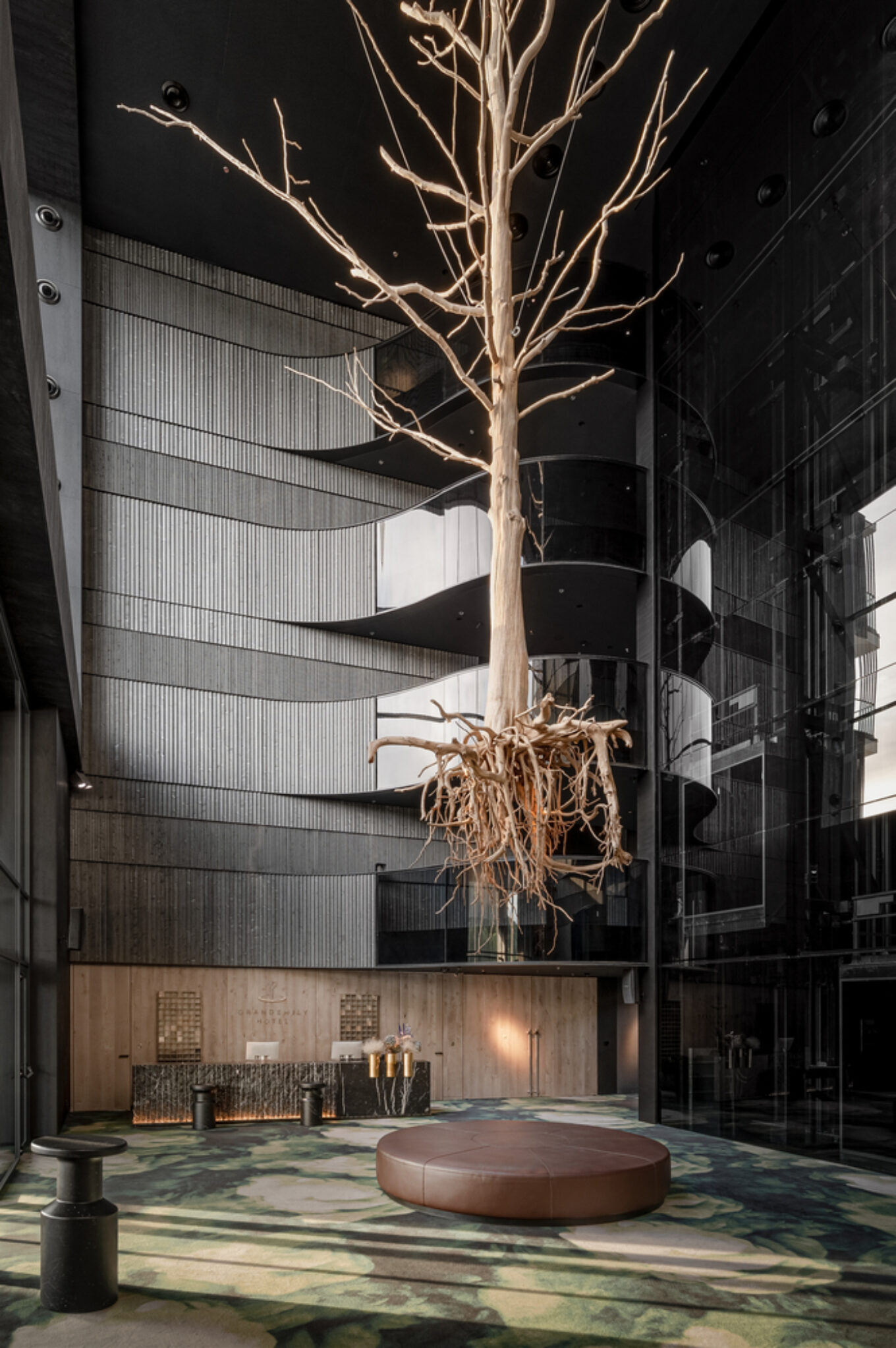 Готель «Grand Emily» є частиною нового «Emily Resort» у місті Винники поблизу Львова. Масштабна інсталяція з підвішеним явором в атріумі готелю є знаковим образом всього комплексу. Могутнє дерево пронизує п’ять поверхів. Його органічний силует створює контраст із ритмічною геометрією стін, горизонтальними лініями підлоги, вертикалями дошок на обшивці стін, діагоналями металевих перил на сходах.