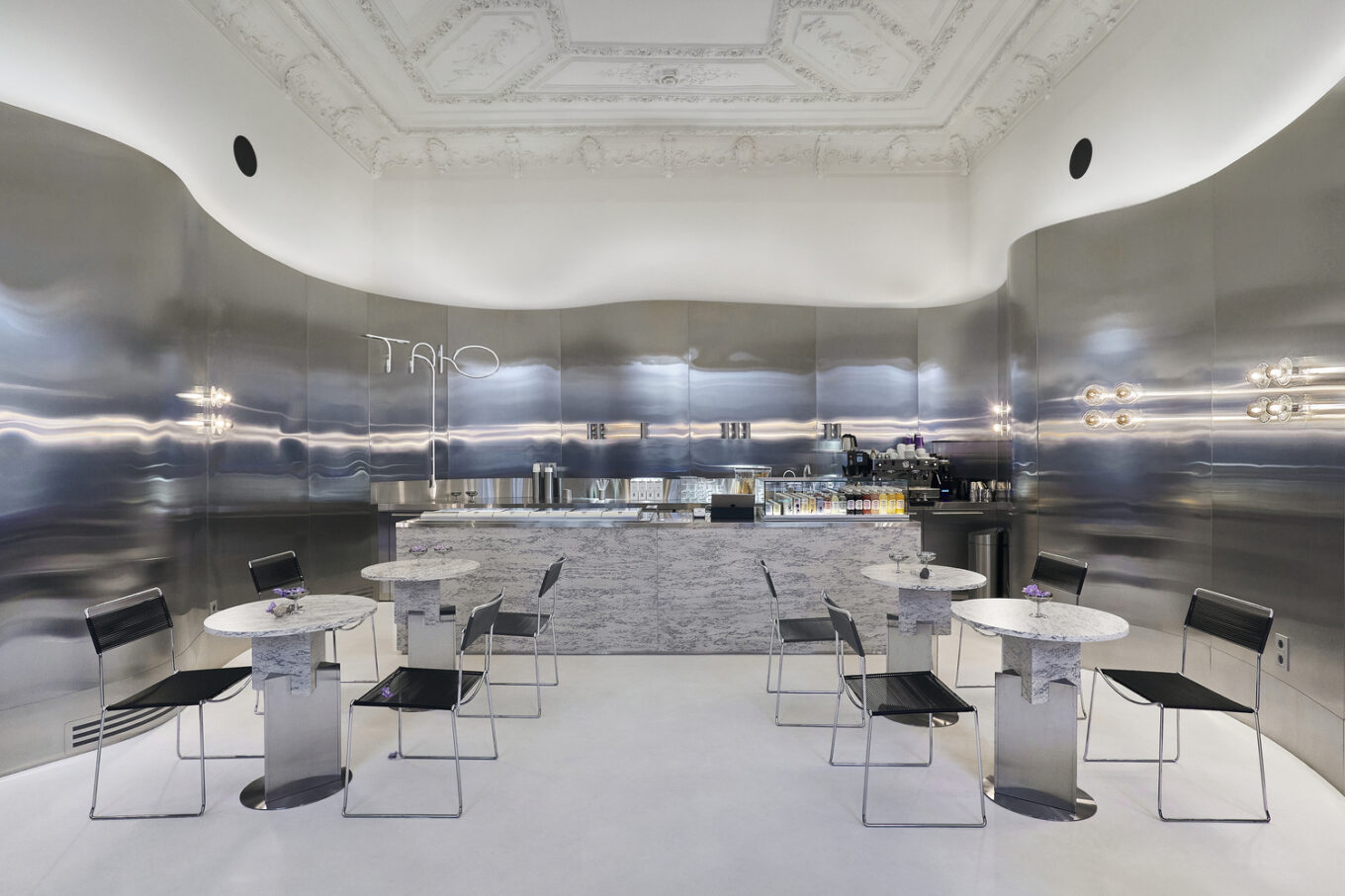 В меню закладу є тільки морозиво та соки, тому дизайнери шукали просте рішення, прості матеріали та одну чітку ідею, яка б і об’єднала весь інтер’єр. Назва закладу “Таю” та морозиво надихнули архітекторів на звернення до архітектури класицизму, масивна декоративна стеля стікає в плавні вигини металевих стін.