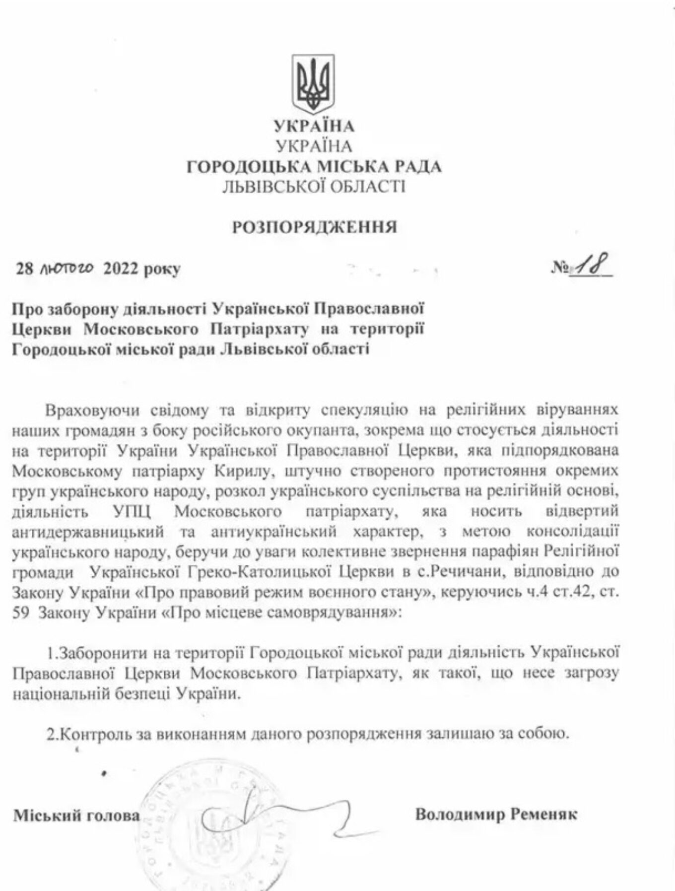Зокрема, першими ініціативу впровадили у Городку, що на Львівщині. Очільник міста Володимир Ременяк розпорядився заборонити діяльність Української православної церкви московського патріархату ще 28 лютого.
