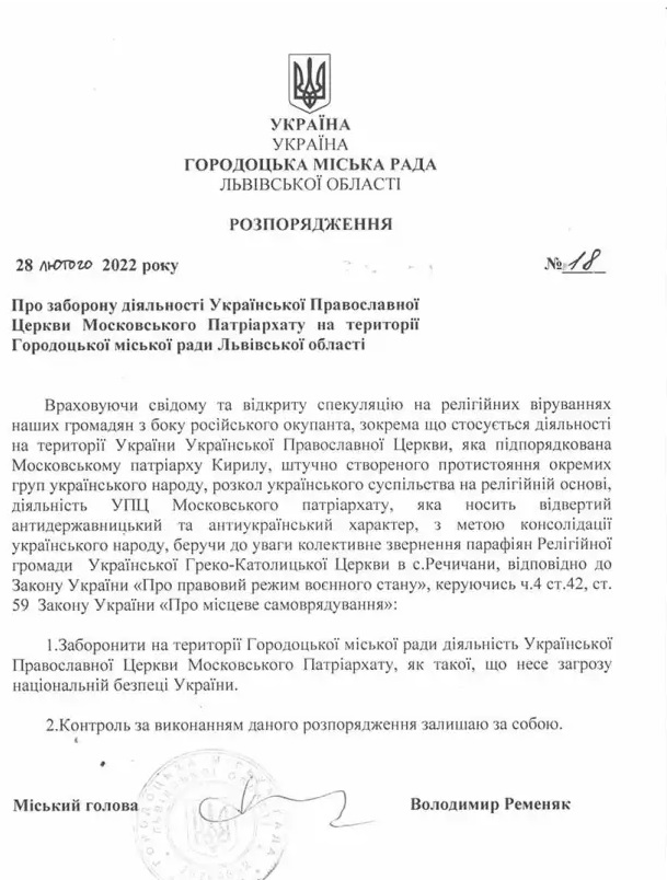 Зокрема, першими ініціативу впровадили у Городку, що на Львівщині. Очільник міста Володимир Ременяк розпорядився заборонити діяльність Української православної церкви московського патріархату ще 28 лютого.
