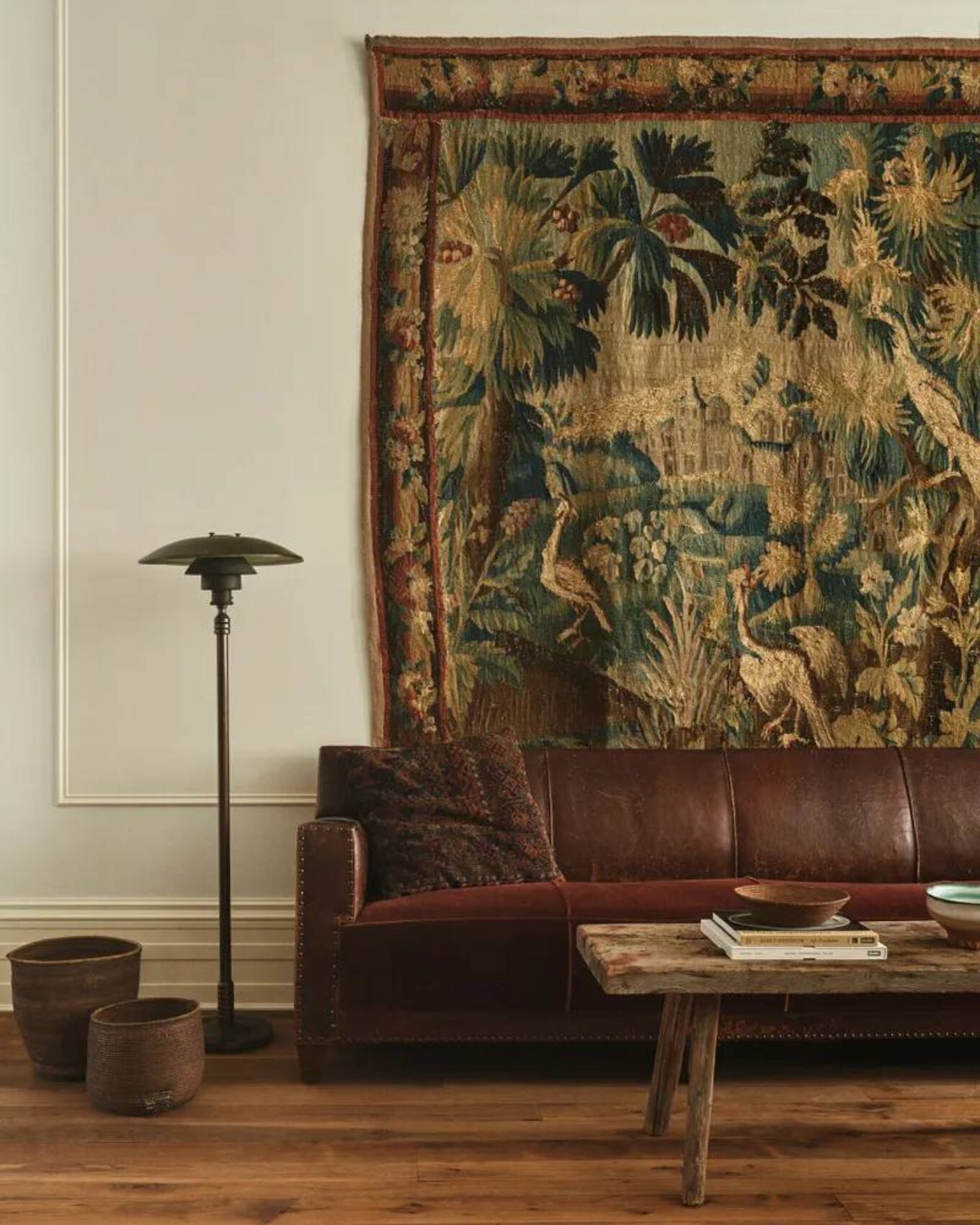 Щоб доповнити колекцію антикваріату Буллок, дизайнери додали раритетний фламандський гобелен, який покриває високу стіну, та дивани, які обрамляють камін у вітальні.