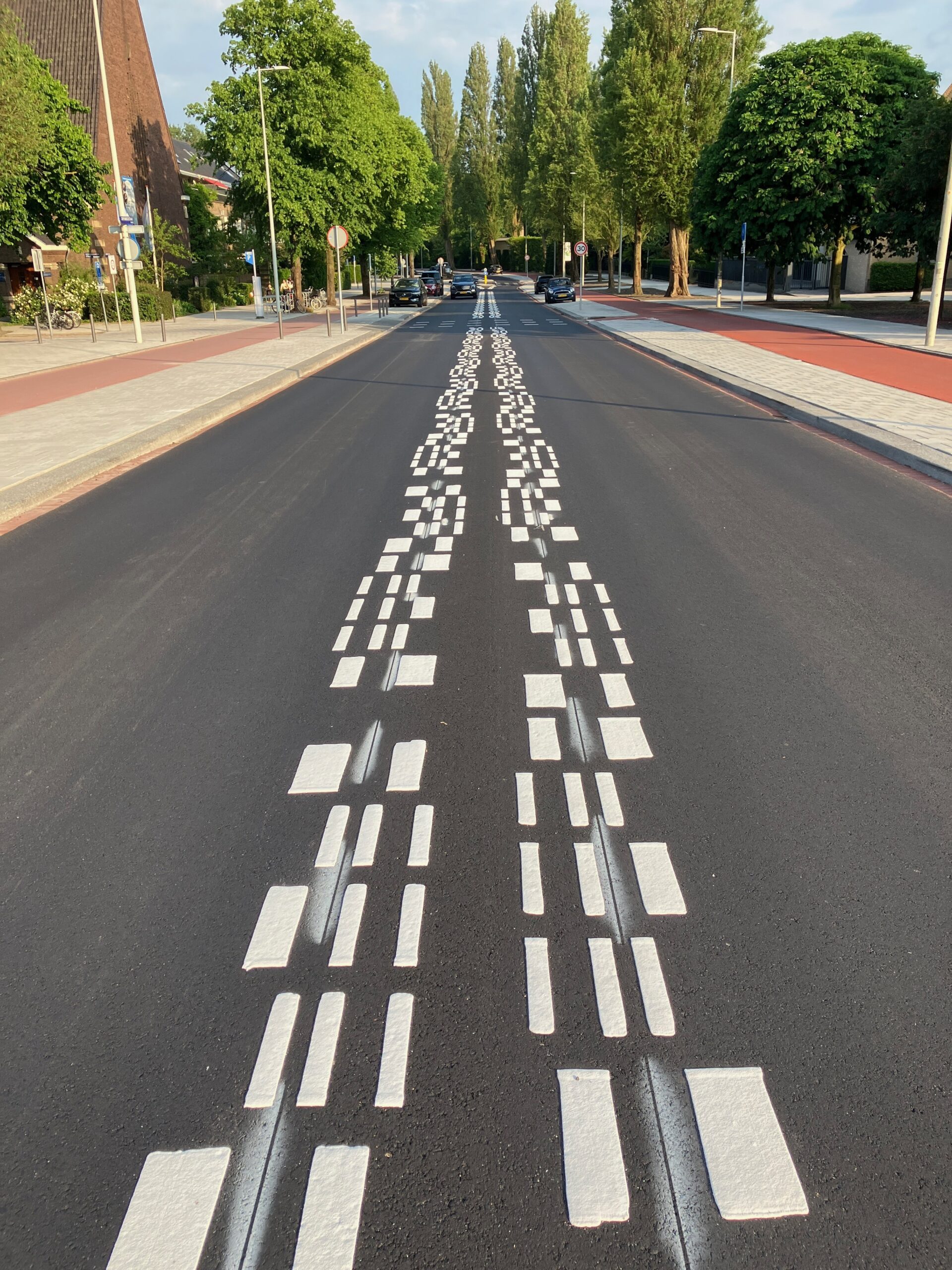 Друга методика передбачає створення нового типу центральної смуги. Замість звичайних безперервних або перериваних ліній, які звикли бачити водії, на смузі буде візерунок білих блоків, що утворюють число 30, яке вказує на швидкість. Цифри правильно видно лише з місця сидіння водія.