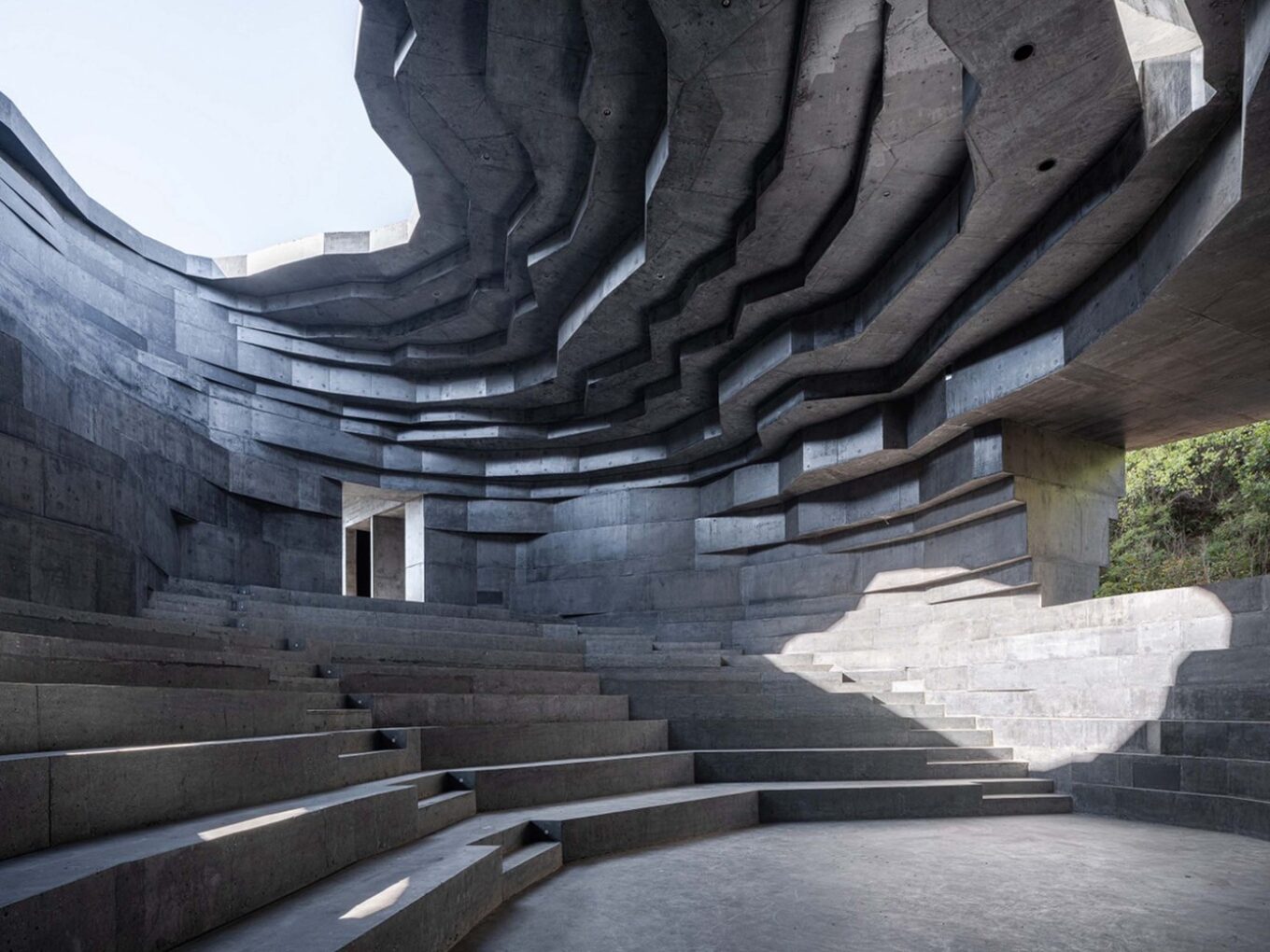 Концепт скелястого концерт-холу втілили у проєкті Chapel of Sound, розташованого посеред гірської місцевості у Китаї. Завдяки поєднанню мінеральних порід і бетону як будівельних матеріалів, будівля виглядає так, ніби її створила природа.