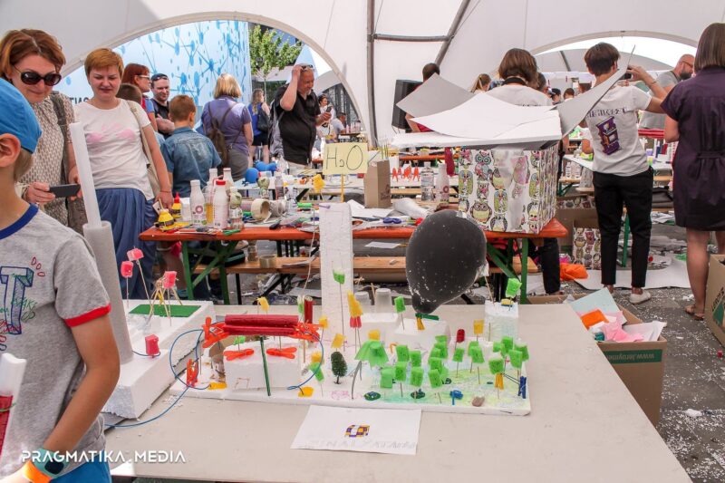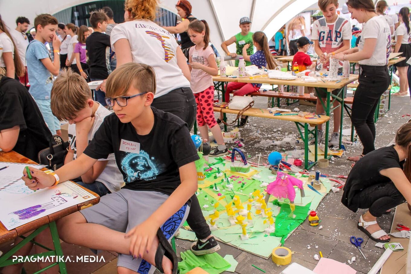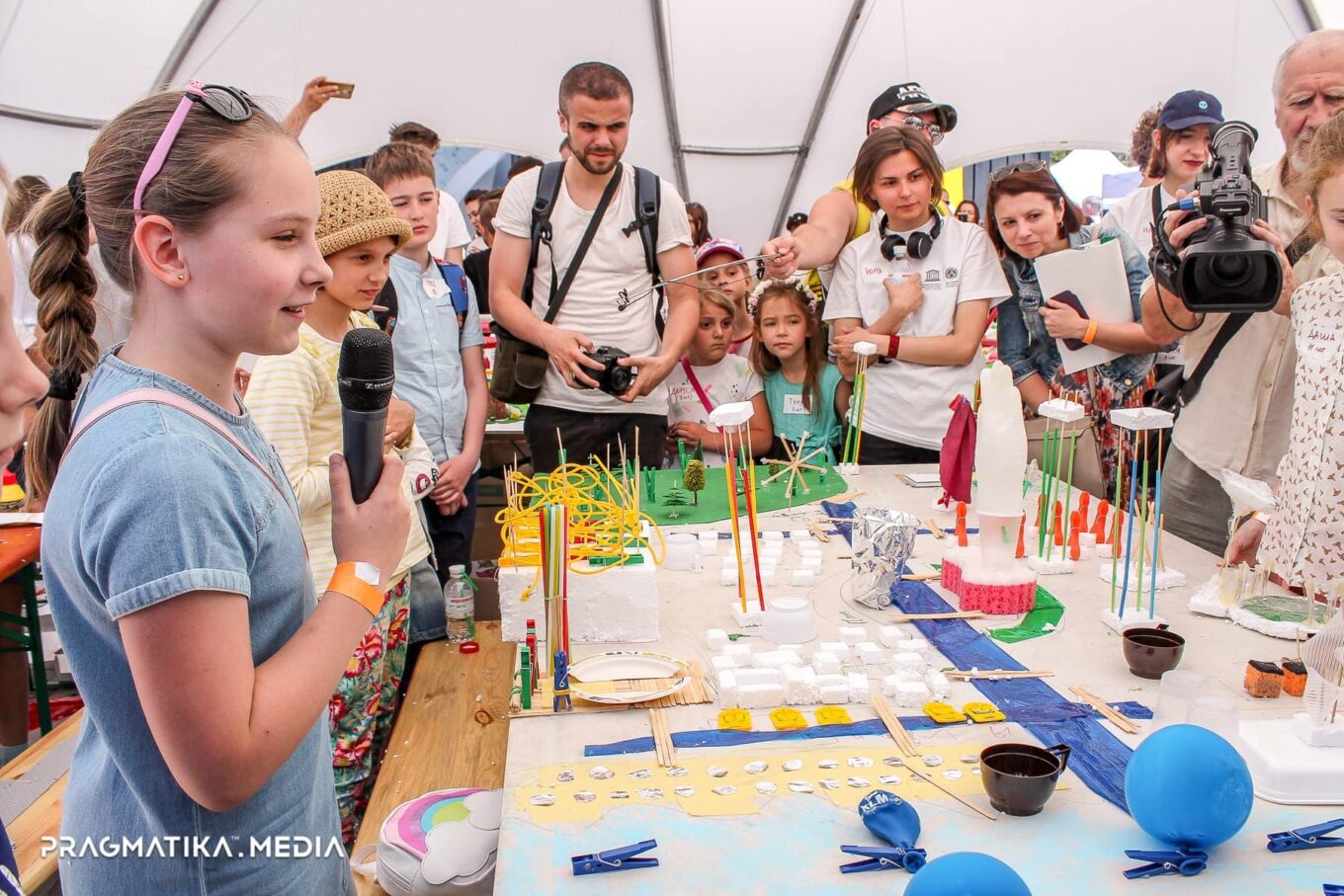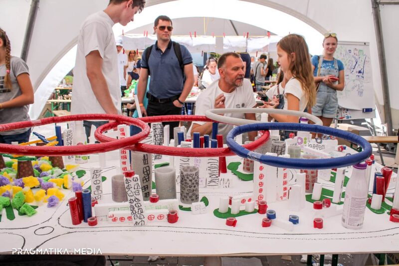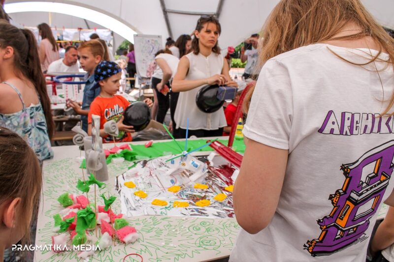 Само интересное на Archikidz! Ukraine происходит под белыми шатрами открытой зоны KIDZ. Дети разного возраста от 7 до 14 лет разбиваются на команды и под руководством опытных архитекторов создают из выданных материалов проекты города будущего, а затем, как и положено всякому архитектору, представляют их, знакомя и других участников, и зрителей со своими идеями и концепциями. В первый день фестиваля модели своих городов представило более 10 команд.