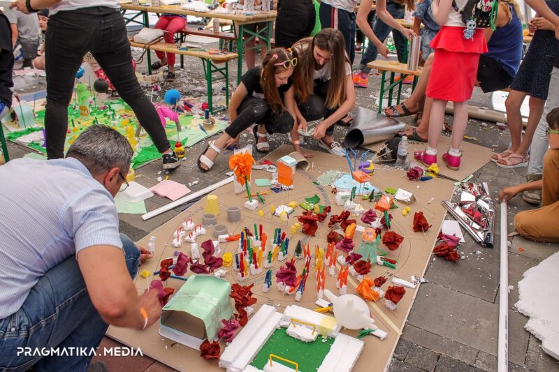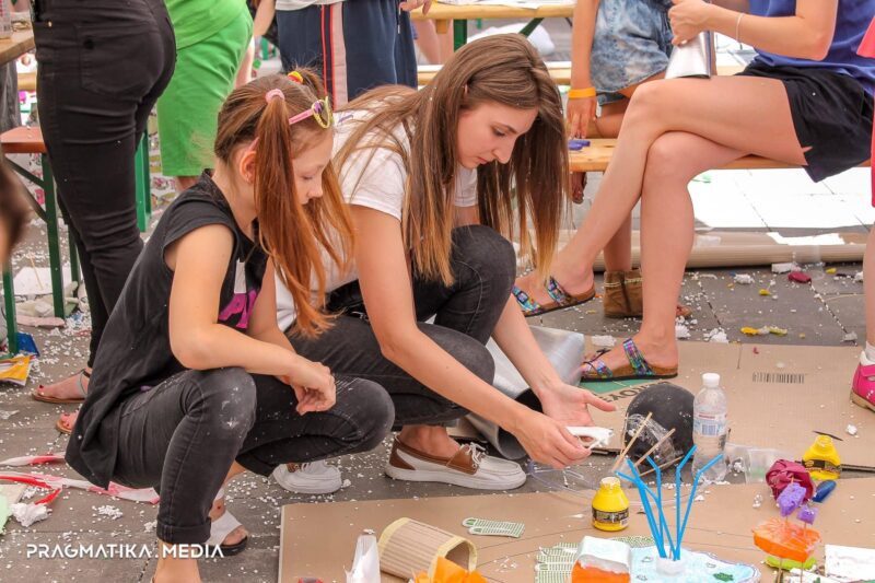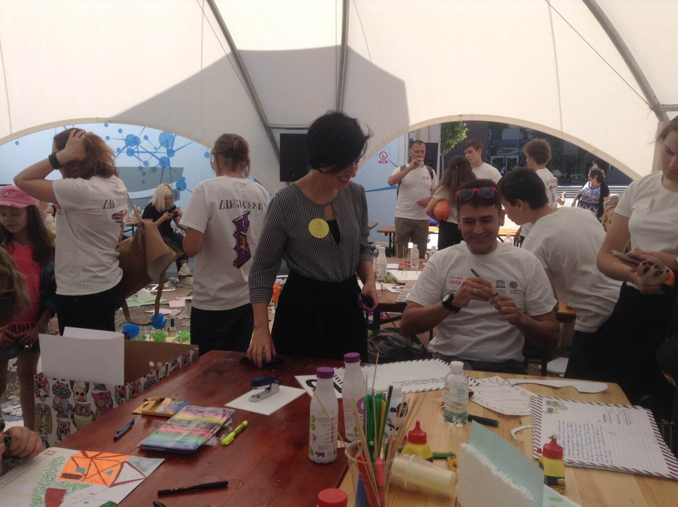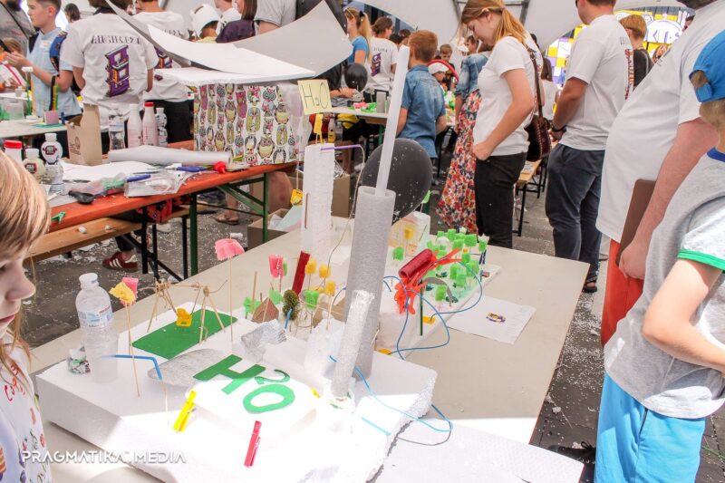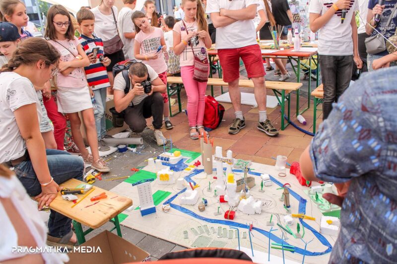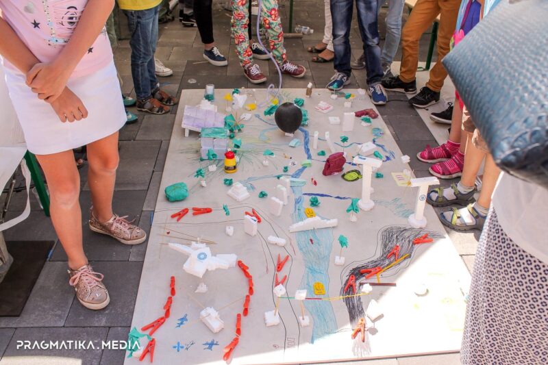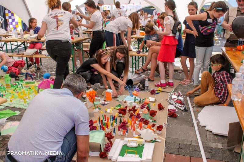 Само интересное на Archikidz! Ukraine происходит под белыми шатрами открытой зоны KIDZ. Дети разного возраста от 7 до 14 лет разбиваются на команды и под руководством опытных архитекторов создают из выданных материалов проекты города будущего, а затем, как и положено всякому архитектору, представляют их, знакомя и других участников, и зрителей со своими идеями и концепциями. В первый день фестиваля модели своих городов представило более 10 команд.
