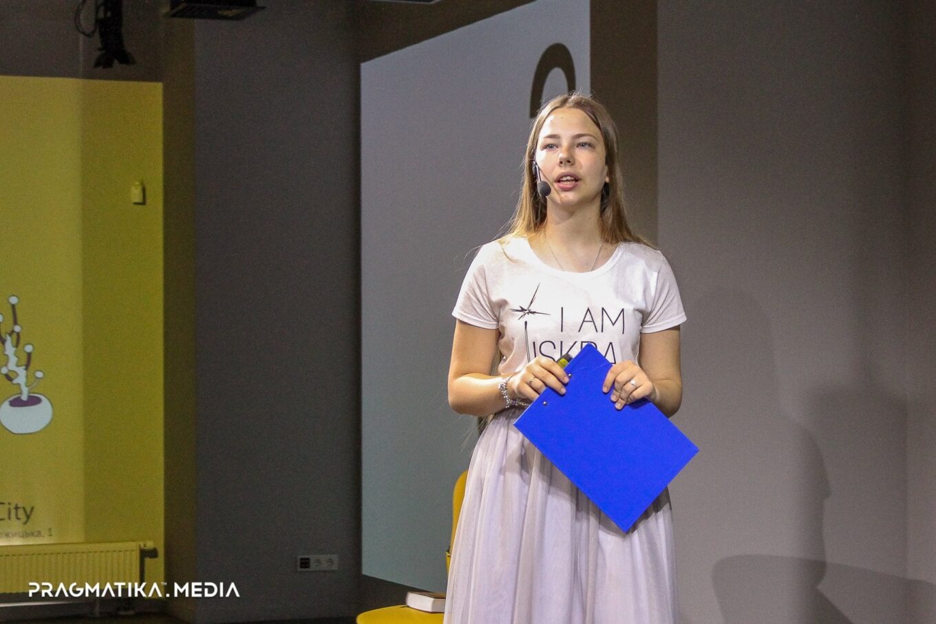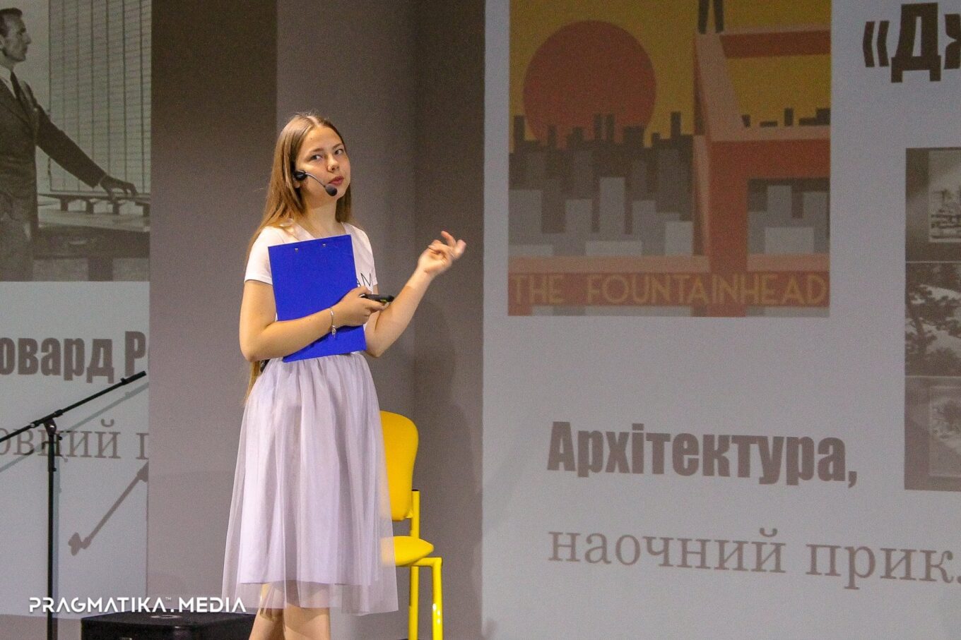 Юный гений IT-технологий, выпускница гимназии №152 Вероника Рахуба провела мастер-класс «Стартап: от идеи к успеху». София Сосинович в своем докладе «Прокрастинация — наш главный враг и как его побороть» учила бороться с ленью и откладыванием важных дел в долгий ящик, а Анна Евсейчик, ведя диалог с публикой на английском языке, в своей теме «Как быть более продуктивным» коснулась эффективности работы обучения. Президент ученического самоуправления Шевченковского района и основательница Молодежной платформы IISKRA для совета старшеклассников «ШАРМ» Антонина Митракова в своей лекции «Объективизм. Модное слово или решение что меняет жизнь» затронула тему философского направления рационального индивидуализма и трудов его основательницы — американской писательницы Айн Рэнд, в частности романа «Истоник», где речь идет о талантливом архитекторе Говарде Рорке, не желающем мирится с навязываемой конъюнктурой профессиональной среды.