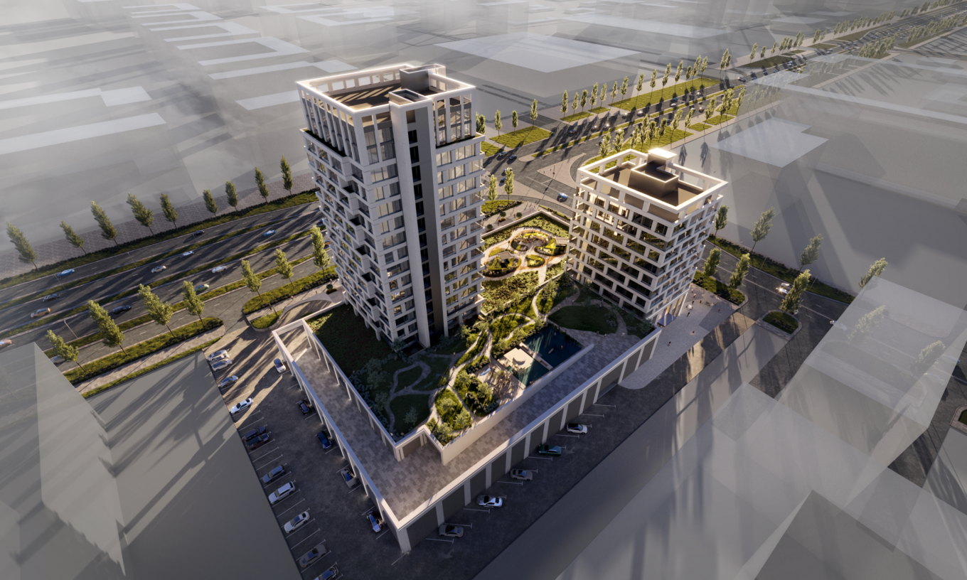 На перших поверхах по вулиці Оринбор та по пр. Туран архітектори облаштували комерцію – зокрема, фудмаркет. На решті площі першого поверху передбачили вбудований паркінг, що дало додаткову змогу паркування як для мешканців, так і для відвідувачів фудмаркету.