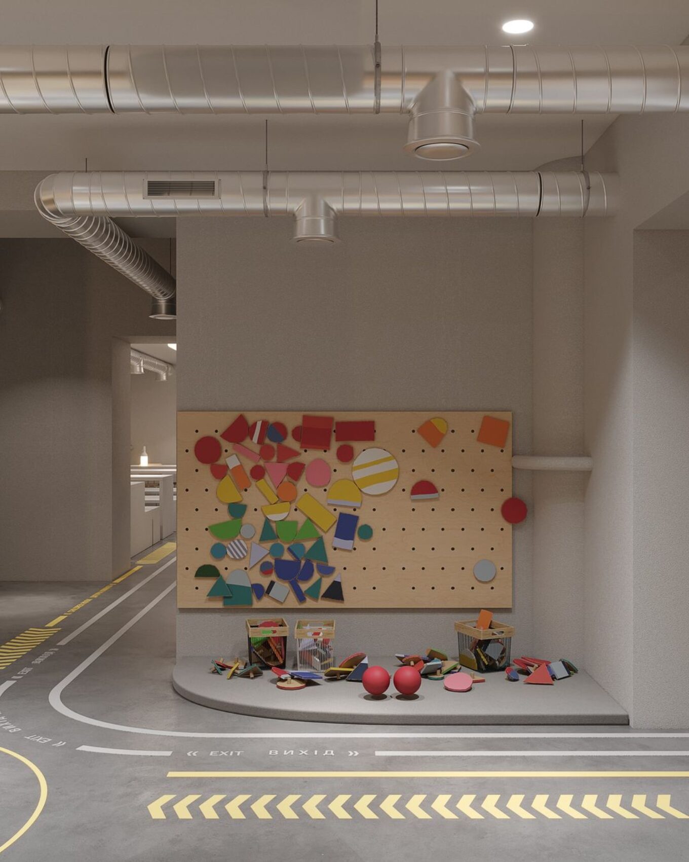 Дизайн навмисно створювали з використанням м’яких та світлих відтінків сірого з кольоровими акцентами на підлозі.