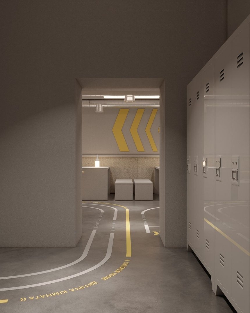 Укриття має два доступних входи. На підлозі розміщена чітка навігація з кольоровими стрілками та надписами, що допоможуть орієнтуватись і знайти відповідну кімнату.