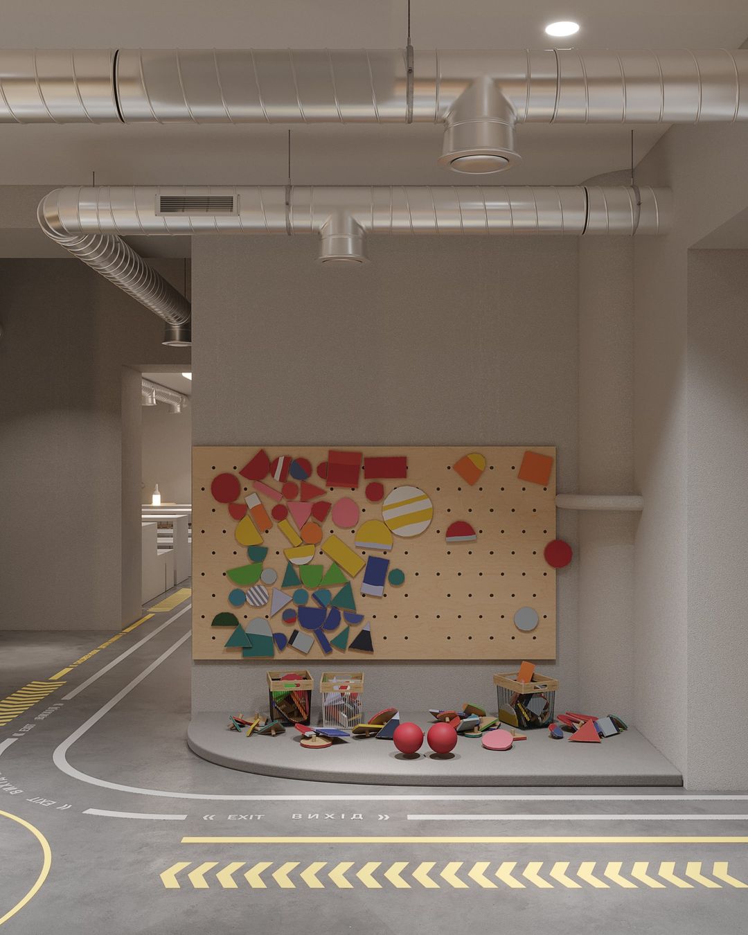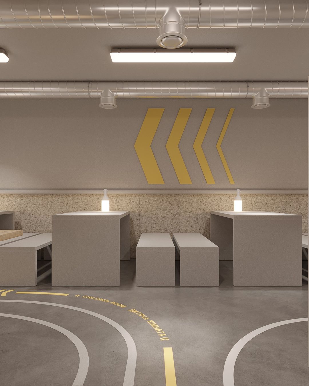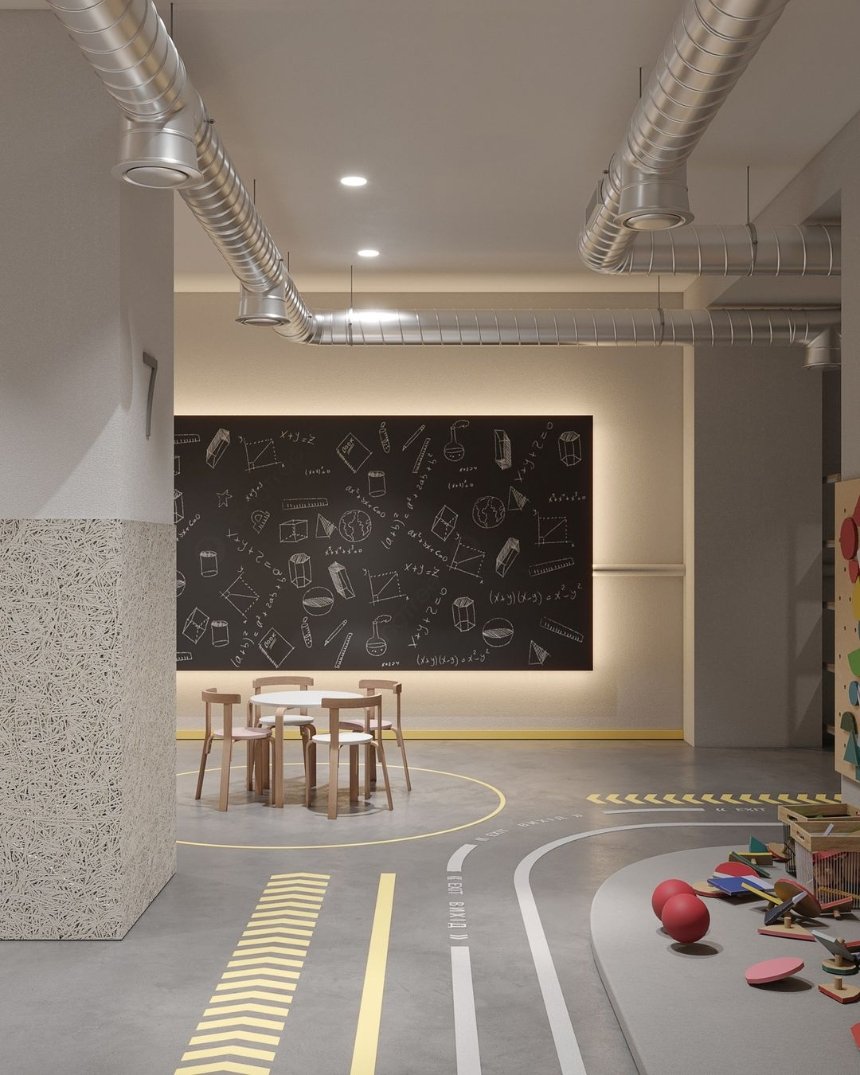 Дизайн навмисно створювали з використанням м’яких та світлих відтінків сірого з кольоровими акцентами на підлозі.
