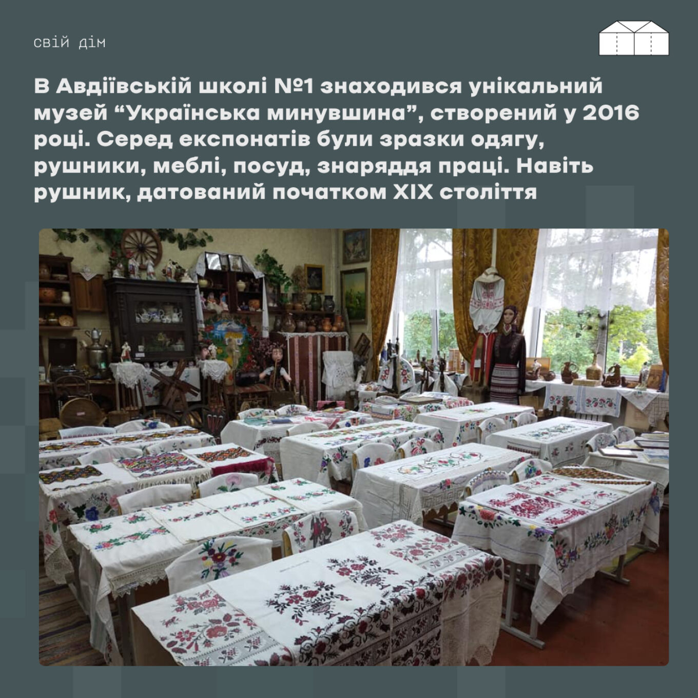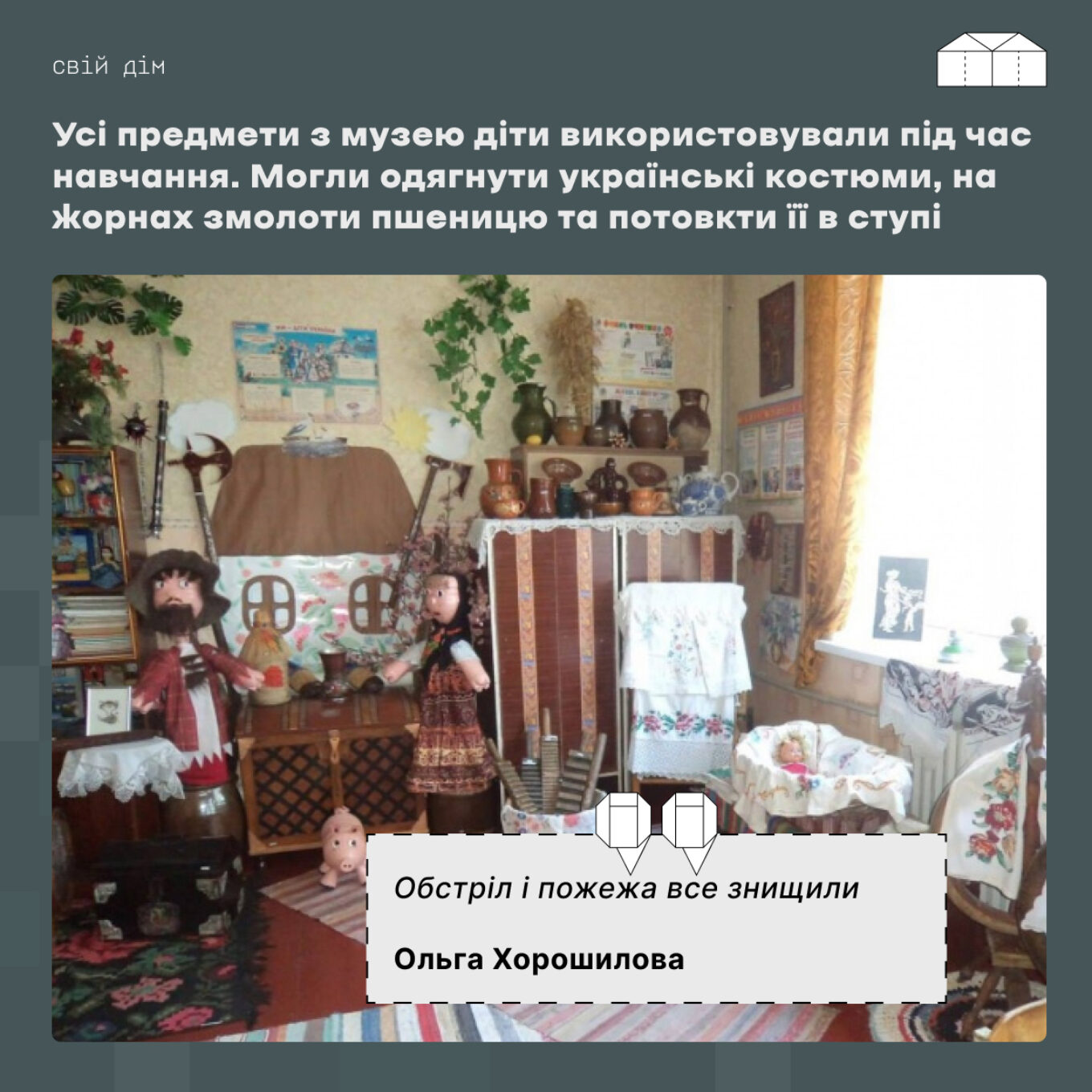 “У 2015 році в класах було мало учнів. Щоб відволікатися від обстрілів і якось зайняти дітей, ми почали робити з пластикових пляшок героїв українських казок. Спочатку створили хату, потім макет печі. А згодом діти почали збирати все, що стосується українського минулого”, — розповідала вчителька історії Людмила Кльова телеканалу “Симон”.