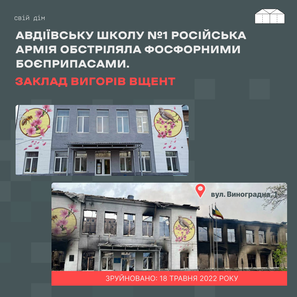 Авдіївську школу №1 російські окупанти обстріляли фосфорними боєприпасами. Поряд з будівлею прилітало декілька разів, а останній ворожий удар знищив її вщент.