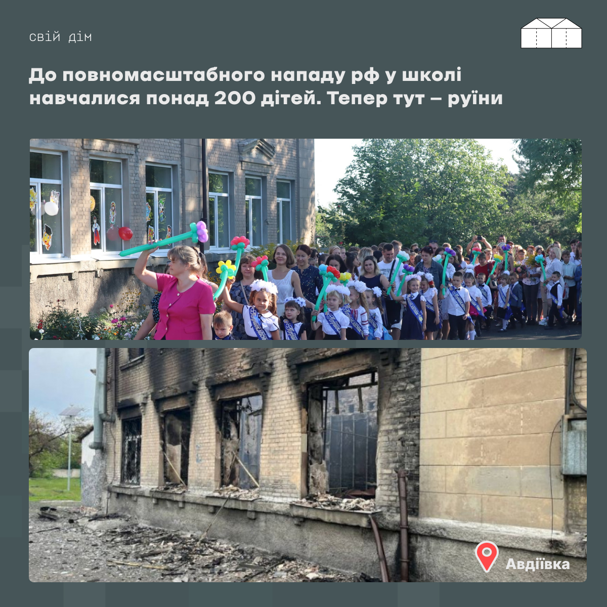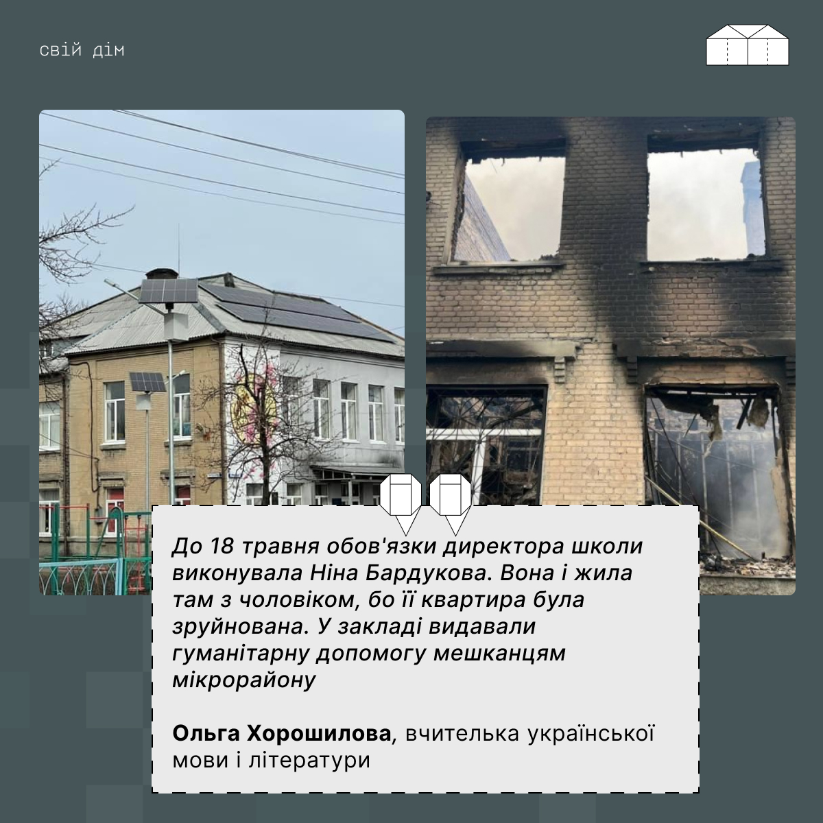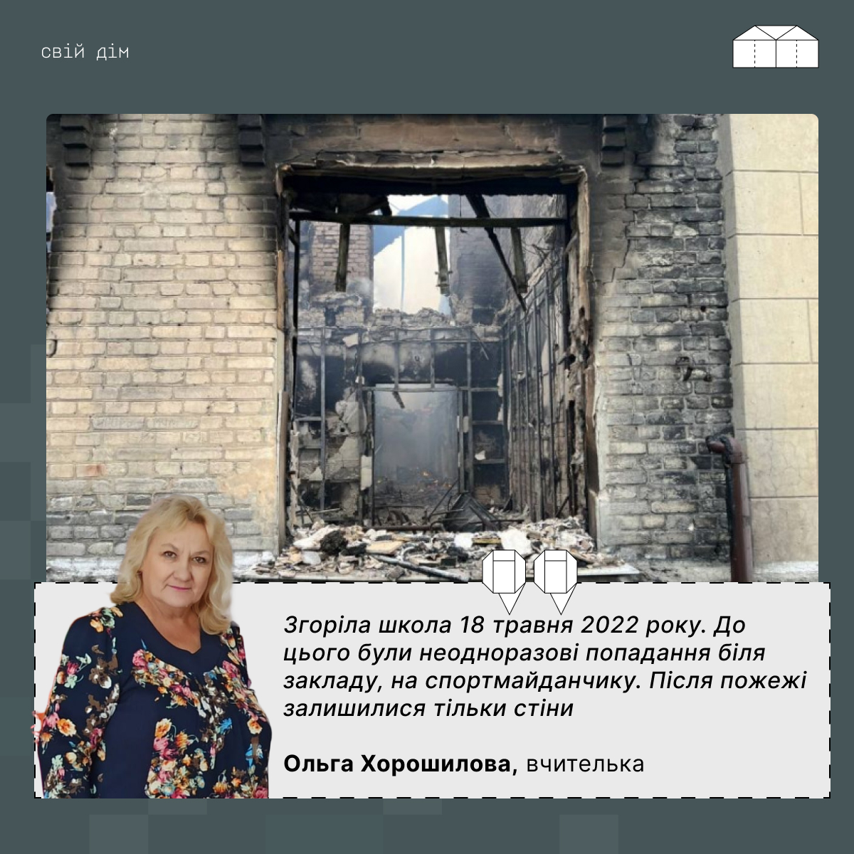 “Після повномасштабного вторгнення у школі працював пункт видачі гуманітарної допомоги й питної води мешканцям мікрорайону. Кілька разів прилітало поруч з будівлею, а у травні 2022 року вона згоріла після обстрілів”, — розповіла журналісту “Свій дім” вчителька Ольга Хорошилова, яка закінчила цей заклад, а з 2003 року працювала тут вчителькою української мови.