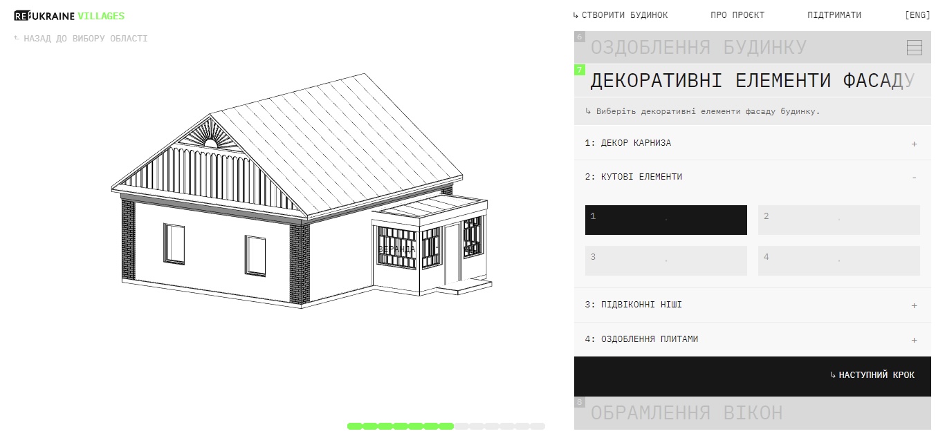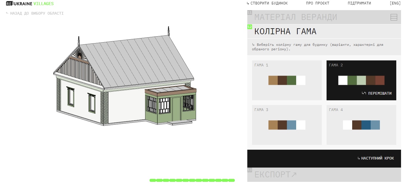 В онлайн-конструкторі RE:Ukraine Villages можна створити віртуальний будинок за дизайн-кодом обраного регіону, а також отримати рекомендації з будівництва або відновлення такого житла. Після пройдення всіх кроків користувач може завантажити pdf-альбом з ізометрією, планами, кресленнями, розгортками фасадів і технічним описом. Файл також містить рекомендації оздоблювальних матеріалів.
