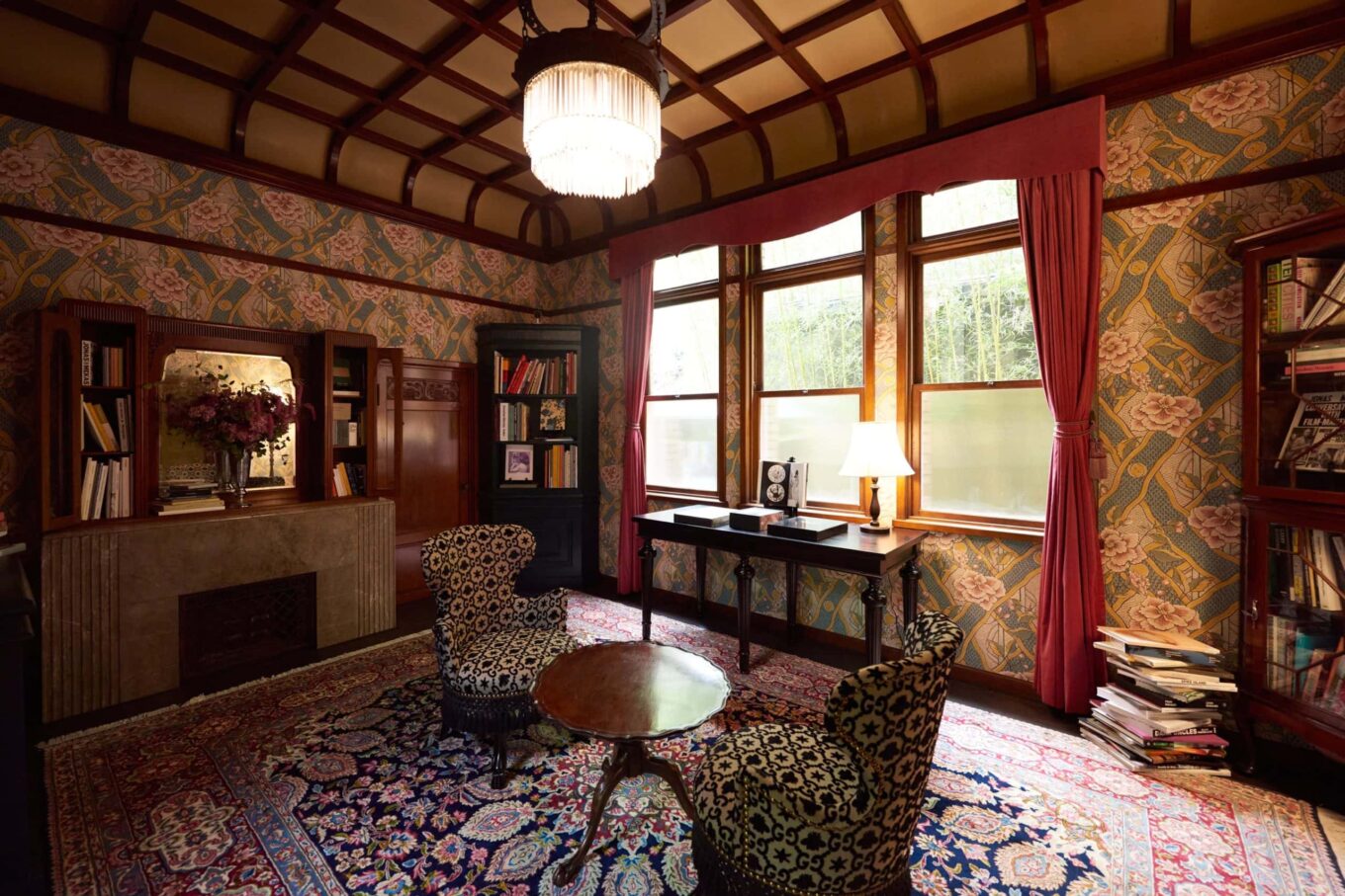 Библиотека с цветочными принтами на обоях, креслами Gucci и собранием книг, побранным брендом. Фото: Gucci