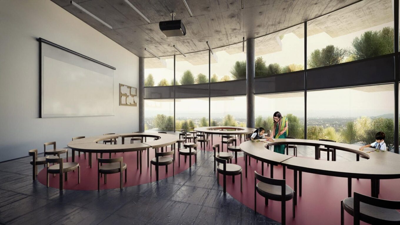 В цоколе здания находятся бассейн и теннисные корты, на первом этаже просторный холл и зал для мероприятий. Классные комнаты занимают пять этажей. Вход в классы расположен из атриумов, а вся фасадная часть находится в пышной зелени. Растения, высаженные на балконах, выполняют роль фильтров, очищая воздух. Также растения защитят классные комнаты от перегрева и будут служить буфером для шума.
