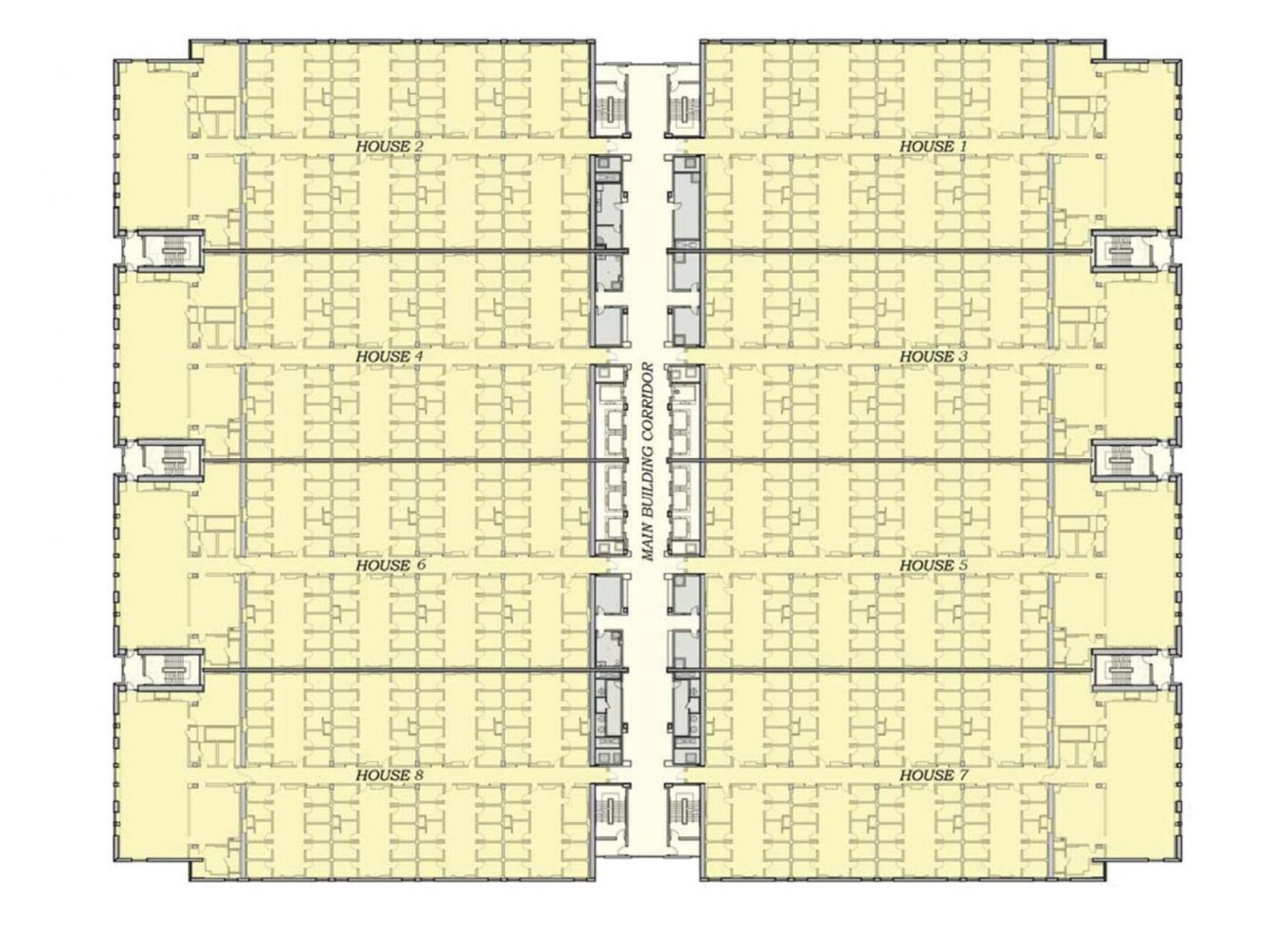 Студентські помешкання групуватимуться в бокси, кожен з яких міститиме п’ять крихітних кімнат, спільну кухню з вітальнею та вбиральні. У більшості приміщень вікно замінятиме спеціальний екран із симуляцією денного світла.
