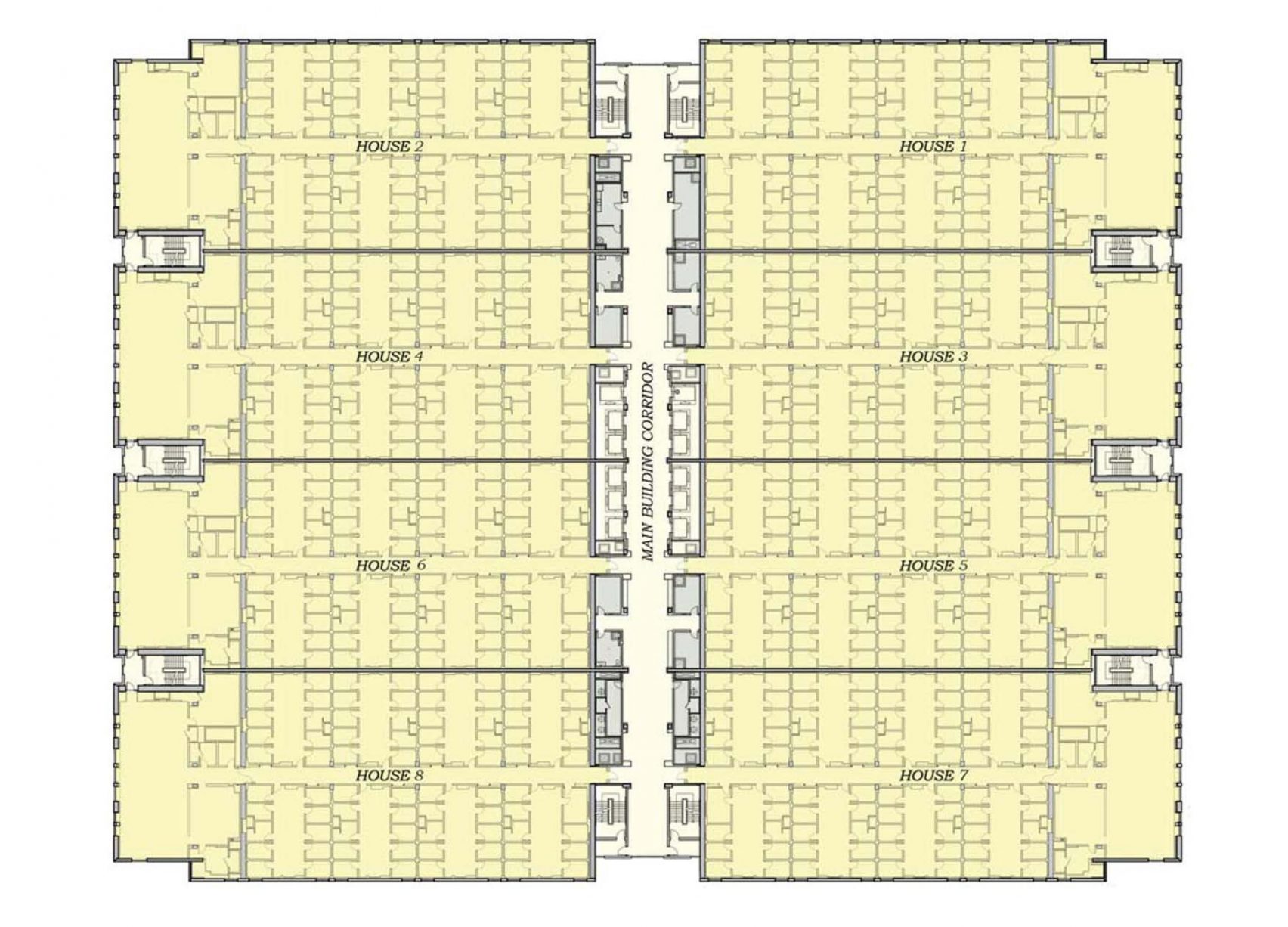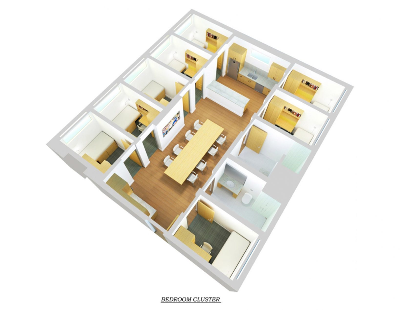 Студентські помешкання групуватимуться в бокси, кожен з яких міститиме п’ять крихітних кімнат, спільну кухню з вітальнею та вбиральні. У більшості приміщень вікно замінятиме спеціальний екран із симуляцією денного світла.