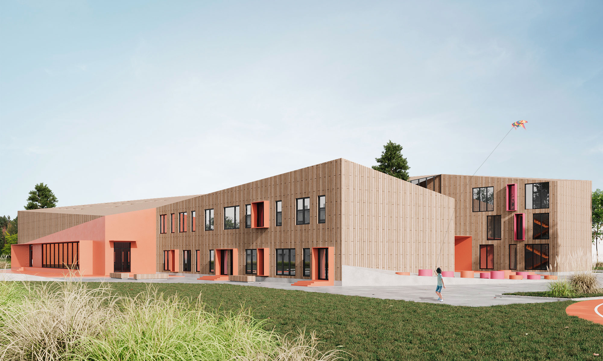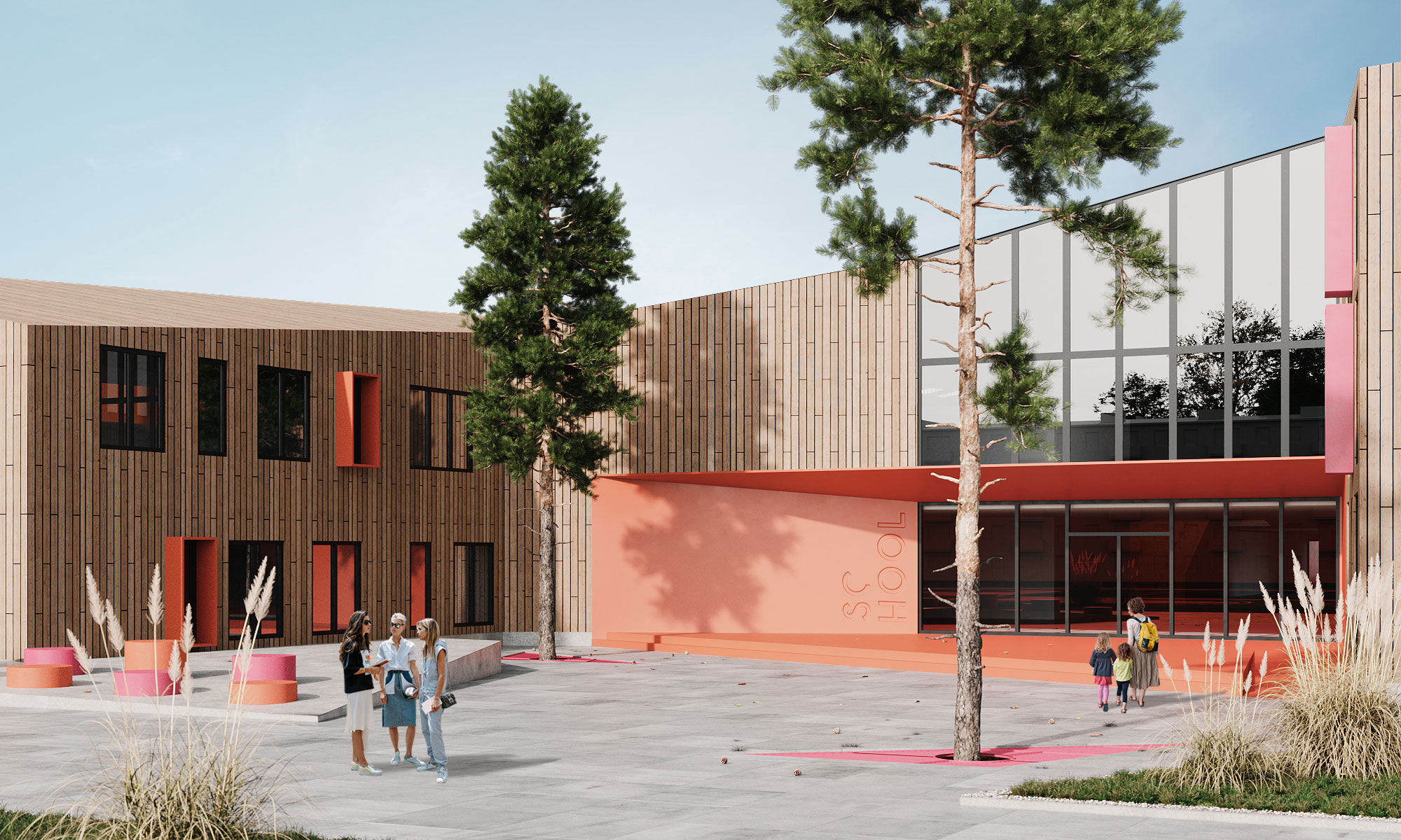 На дворі є спортивні майданчики для проведення футбольних ігор та ігровий майданчик. Зовнішній фасад виконаний з дерева, що відображає ставлення архітектора до внесення екологічних елементів у освітнє середовище.