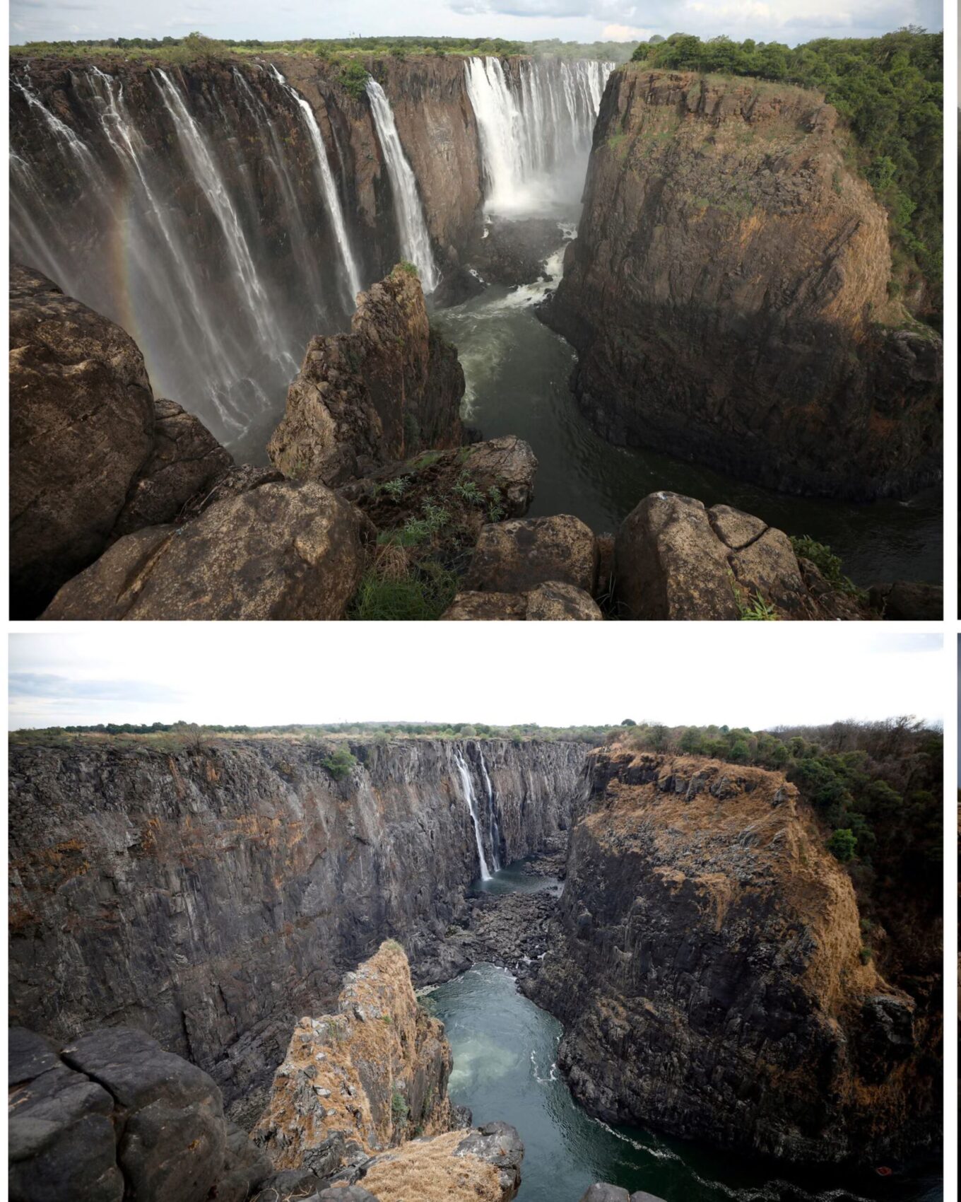 На кордоні між Замбією та Зімбабве, водоспад Вікторія стикається з періодичною посухою, і іноді рівень води в ньому падає до мінімуму.