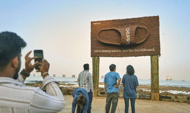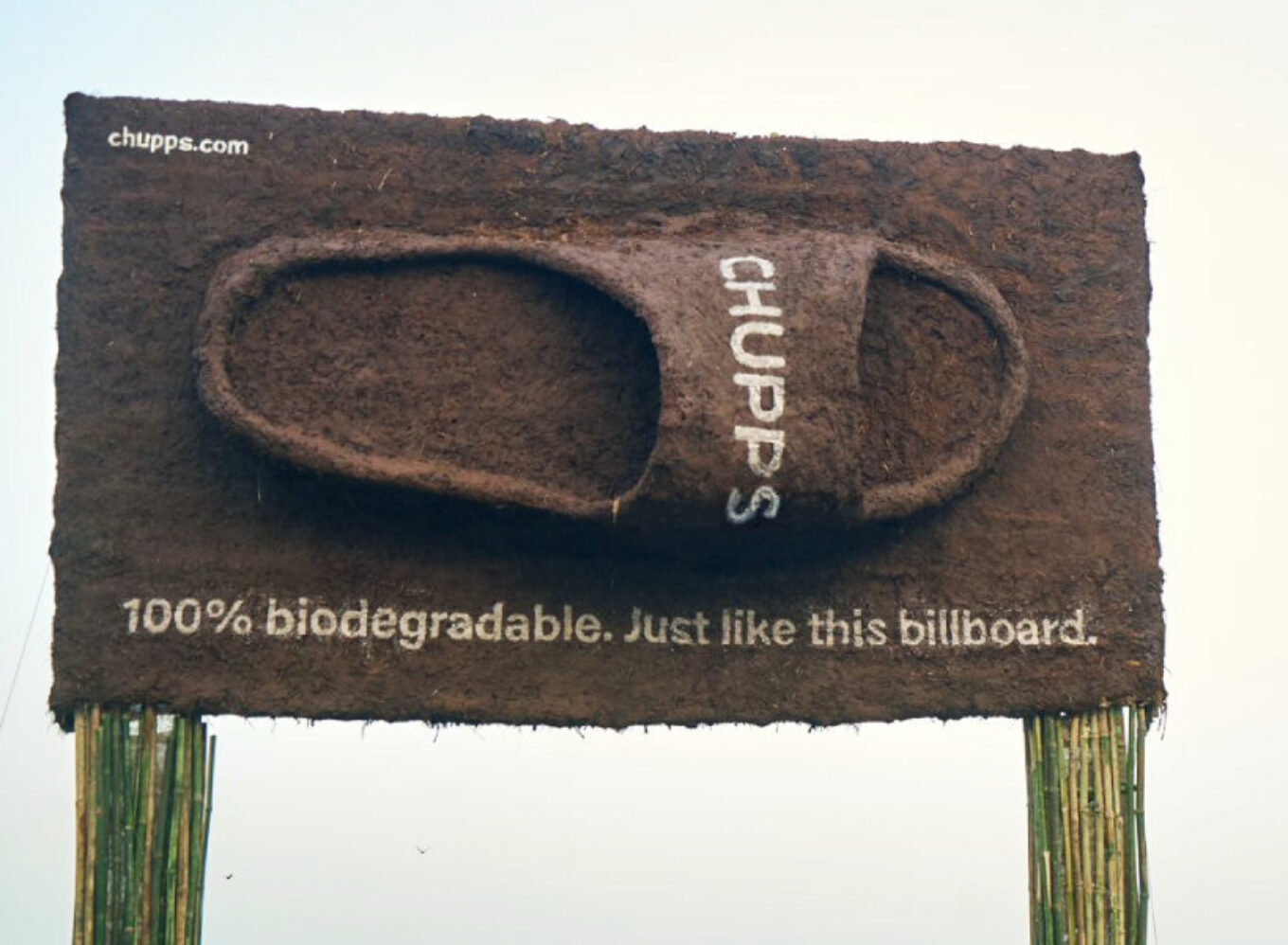 Білборд, виконаний із бруду, сіна, бамбуку, коров’ячого гною та глини, було змонтовано на бамбукових рамах. Головним елементом стала тривимірна сандалія, виліплена з глини та бруду, з білим написом CHUPPS. Вона була інтегрована в площину щита, утворюючи єдину скульптурну композицію, пише Designboom.