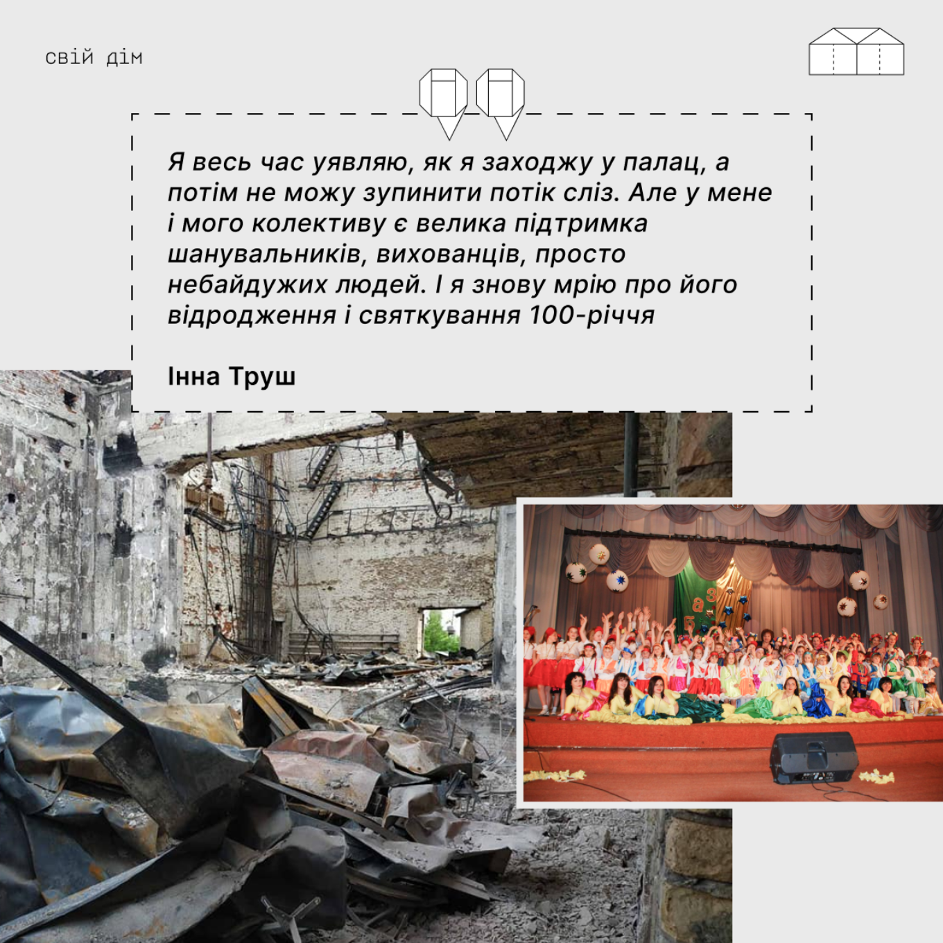 “У ніч 30 квітня десь о півночі до мене додзвонилася моя прибиральниця Тетяна і повідомила, що палац палає. Вона була у підвалах разом з іншими 30 людьми, нарахували 12 прильотів. Тетяна допомагала вийти останнім стареньким, які там були і раптом зв’язок перервався. Я почала дзвонити всім: голові міста, начальнику депо, МНС, але це був надскладний час. До тих пір, поки я не почула знову голос живої Тетяни, а це вже був ранок, я знаходилася в заціпенінні”, – пригадує Інна.
