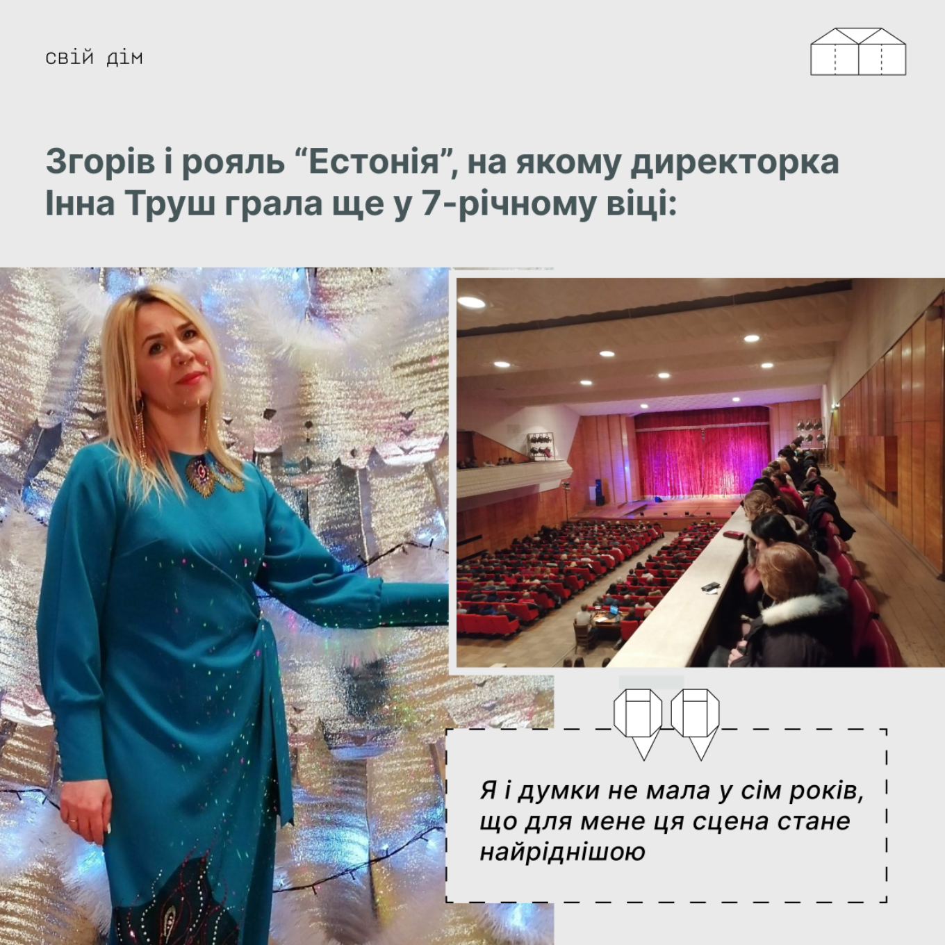 “Велика зала вміщала 850 глядачів, тож гастролюючі колективи з задоволенням відвідували наше місто. До 90-річчя закладу були придбані дороговартісне сценічне освітлення, сценічний професійний лінолеум, звукопідсилювача апаратура, радіосистеми та інше. У 2020 році зробили капітальний ремонт. Нове освітлення, нові барви, комфортні меблі. Усе це ми втратили через війну”, – розповідає вона.
