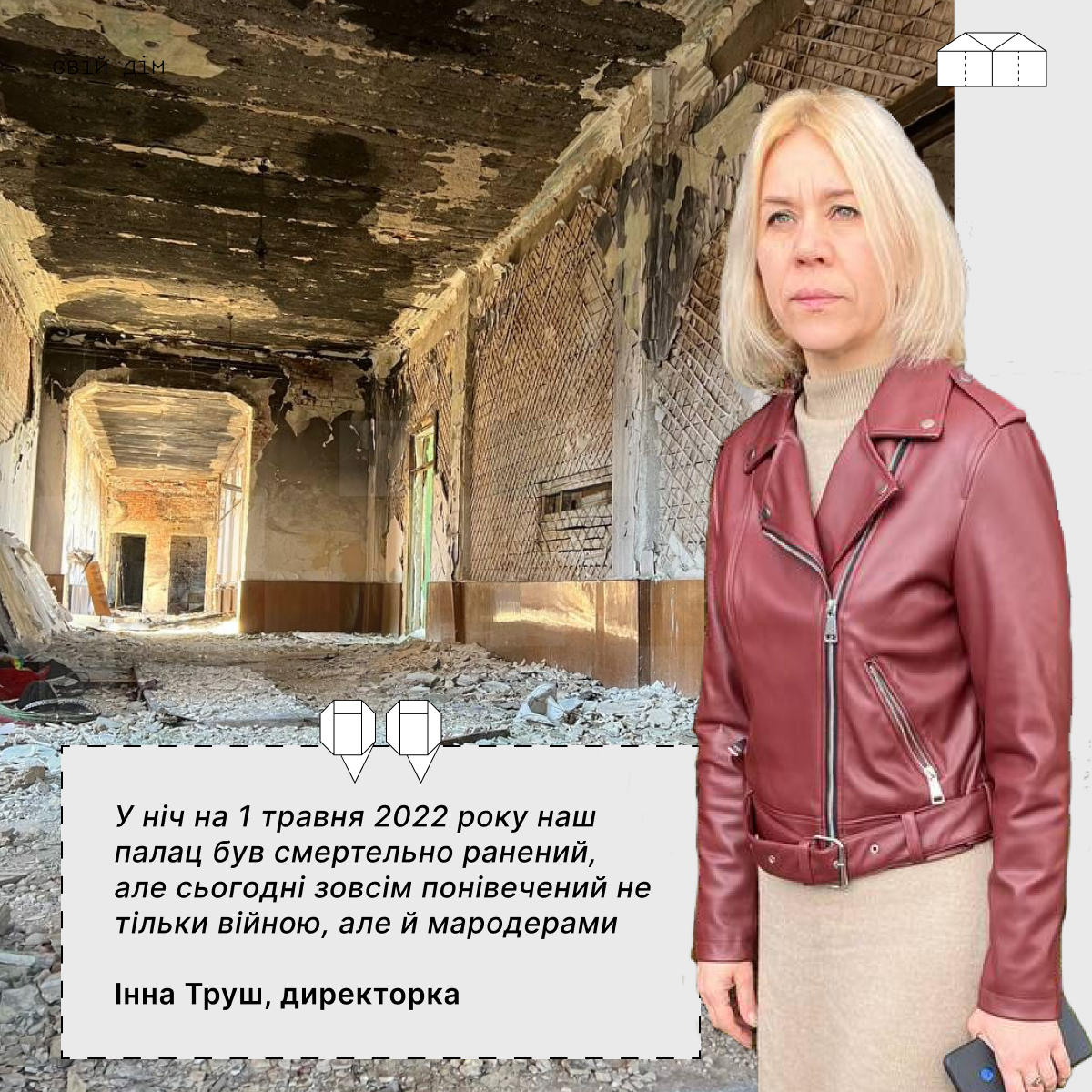 “У ніч 30 квітня десь о півночі до мене додзвонилася моя прибиральниця Тетяна і повідомила, що палац палає. Вона була у підвалах разом з іншими 30 людьми, нарахували 12 прильотів. Тетяна допомагала вийти останнім стареньким, які там були і раптом зв’язок перервався. Я почала дзвонити всім: голові міста, начальнику депо, МНС, але це був надскладний час. До тих пір, поки я не почула знову голос живої Тетяни, а це вже був ранок, я знаходилася в заціпенінні”, – пригадує Інна.