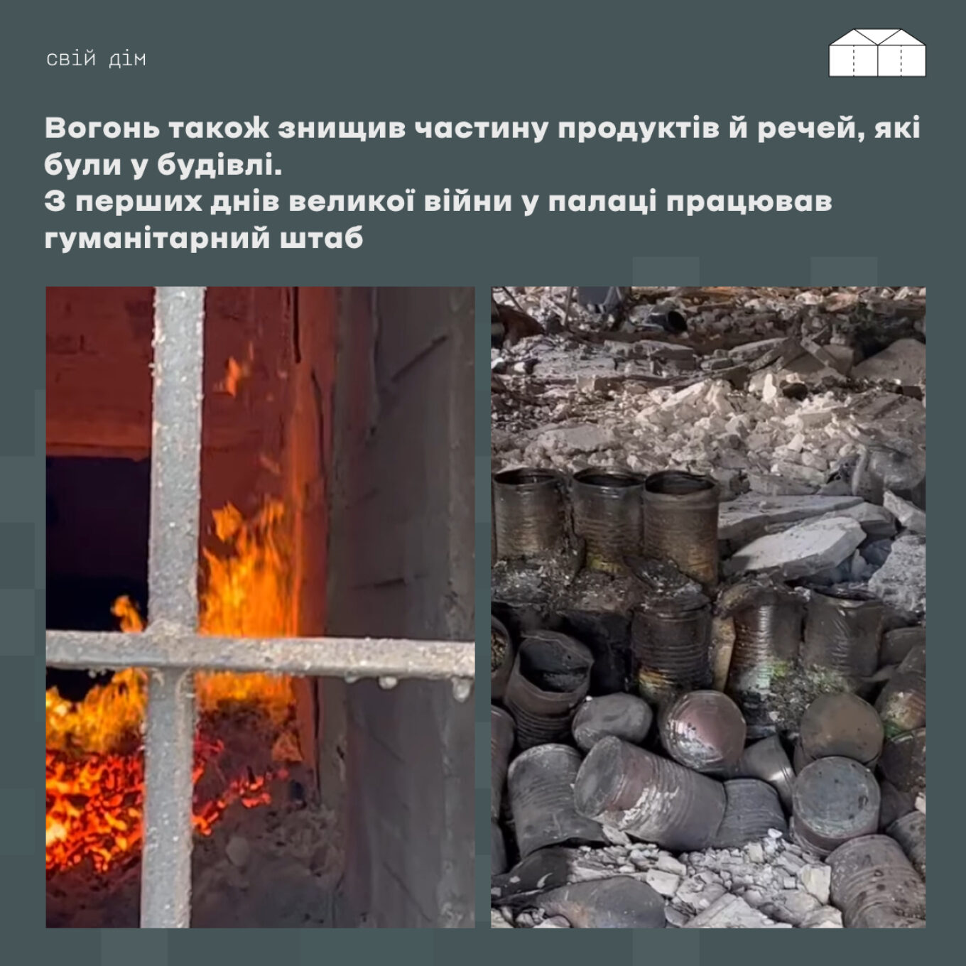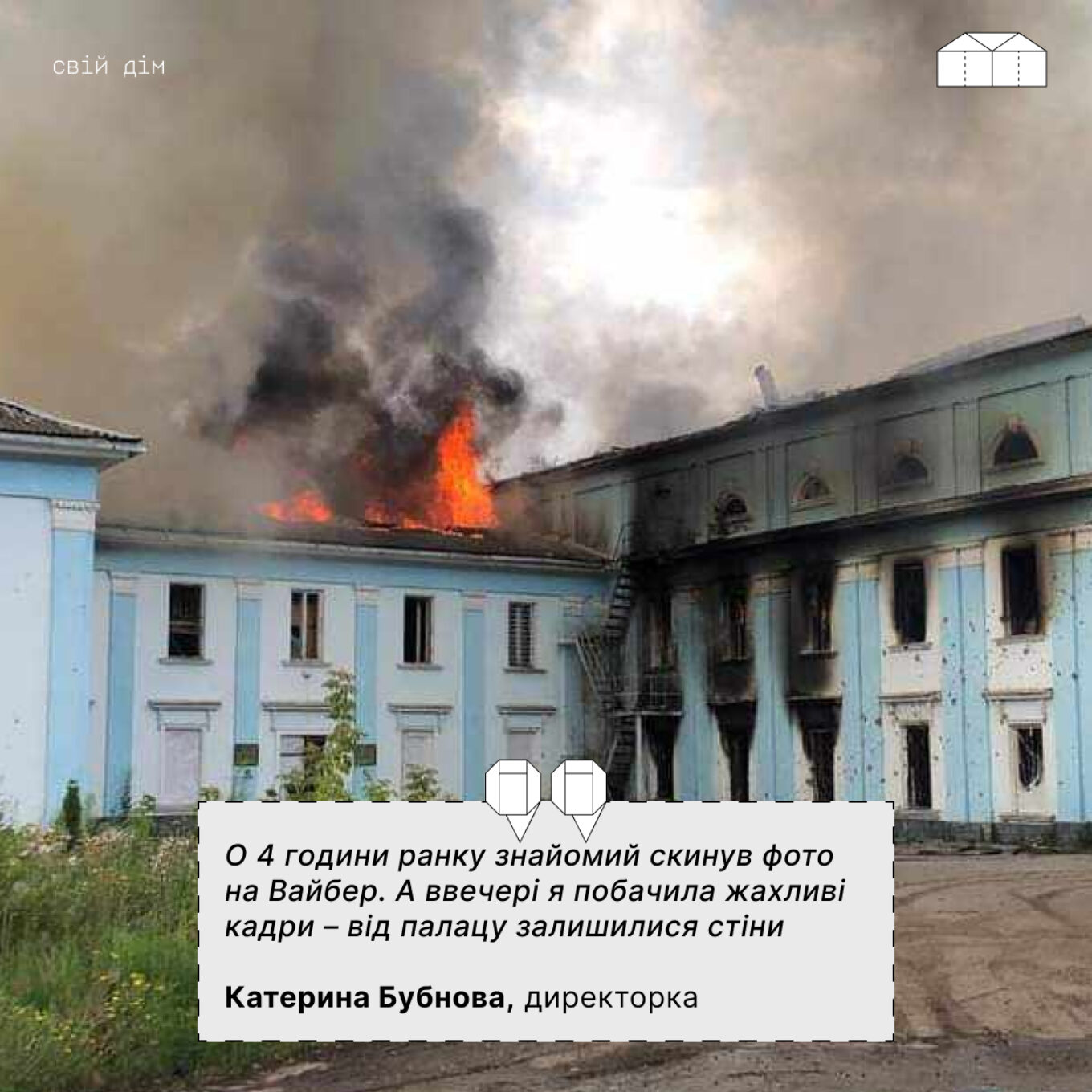 Про влучання в історичну будівлю пані Катерина дізналася о 4-й годині ранку, а ввечері побачила світлини з вигорівшим палацем. Росіяни обстріляли його касетними боєприпасами.