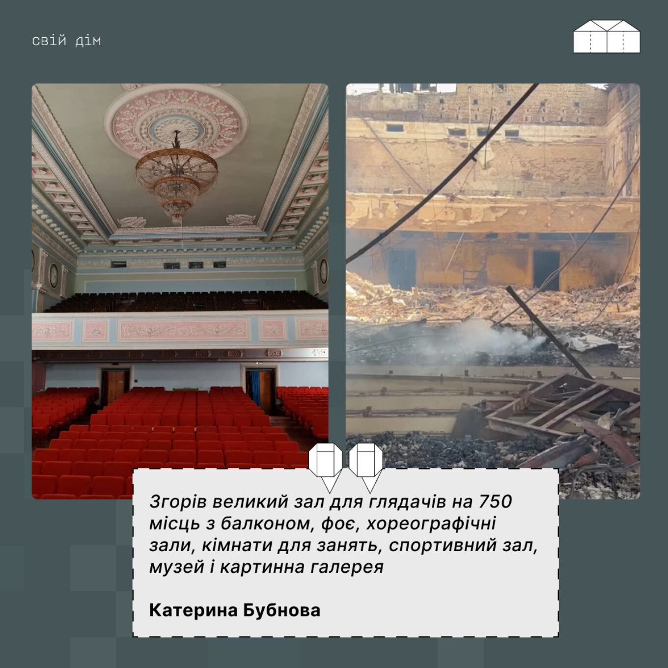 Пані Катерина виїхала з міста рік тому. Після звістки про знищення палацу культури досі не може оговтатись. З ним пов’язано все її життя.