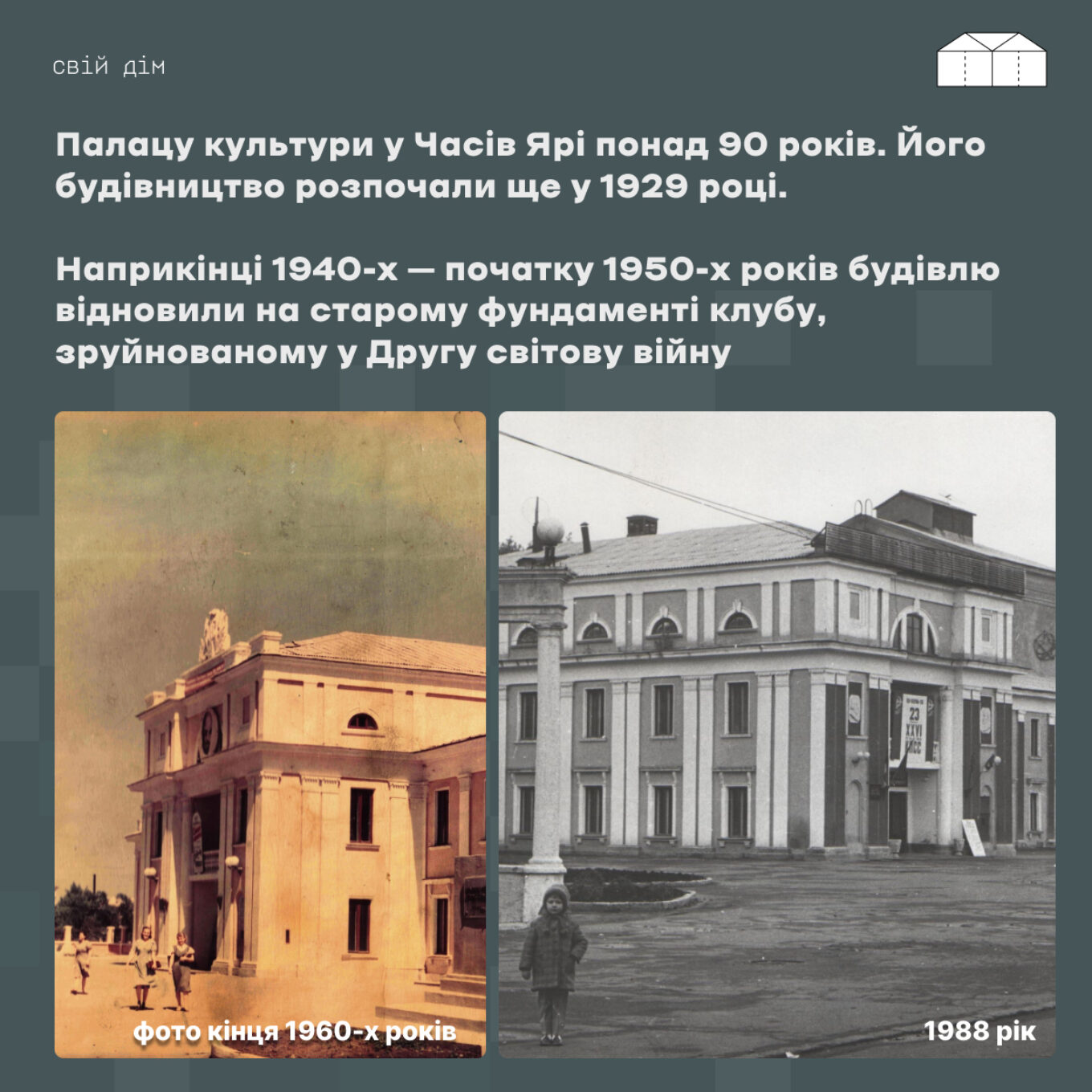 На початку 1930-х років у Часів Ярі звели “клуб Новошамотного заводу” в рідкісному стилі конструктивізму авторства видатного українського архітектора Григорія Яновицького. У 1943-му будівля була зруйнована гітлерівськими окупантами. Наприкінці 1940-х – початку 1950-х рр. її відновили на старому фундаменті у стилі “сталінського ампіру” (спрощеного класицизму).