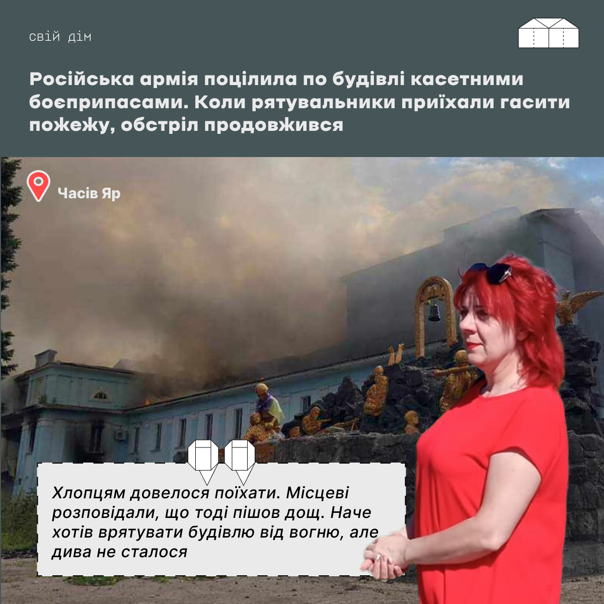 “Палац культури стоїть у самому центрі міста. Першою постраждала школа мистецтв, в якій працювали бібліотека та ЦНАП. Навпроти через дорогу – 15 школа, пів закладу нема. Постраждав стадіон, магазини навколо, контора вогнетривкого комбінату. Я ще казала: “Господи, лягає все навколо палацу”. Розуміла, що може бути прильот і в наш заклад, але не думала про такі масштаби руйнувань”, – розповіла журналісту “Свій дім” Катерина Бубнова, директорка КЗ “Будинок культури Часовоярської міської територіальної громади”.