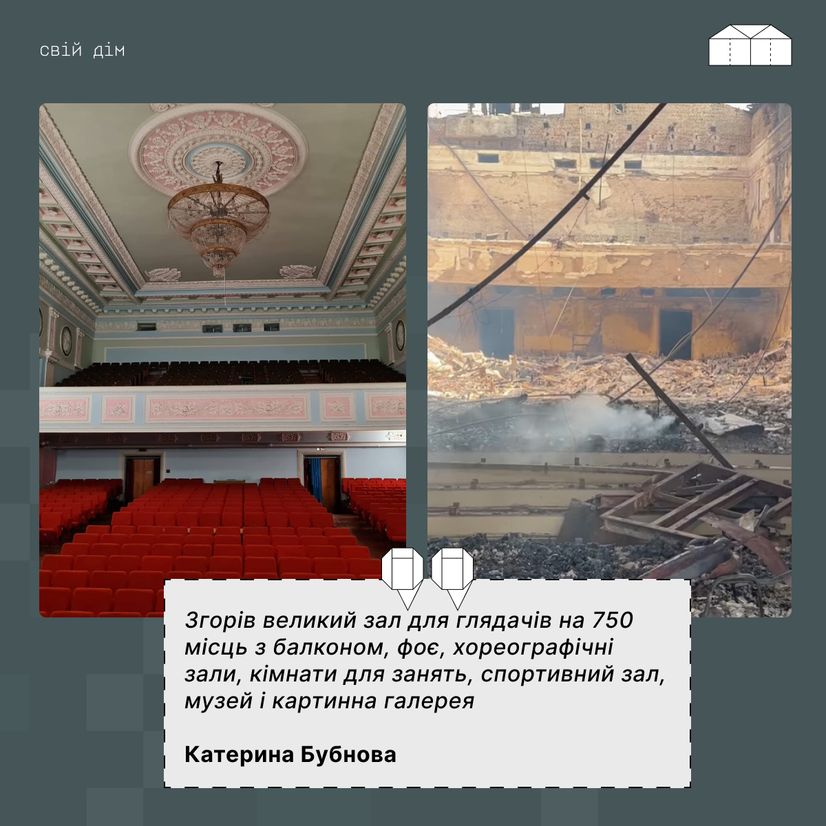 Вогонь знищив зал для глядачів на 750 місць з балконом, малий зал на 80 місць, кімнати для роботи колективів, спортзал, музей і картинну галерею.