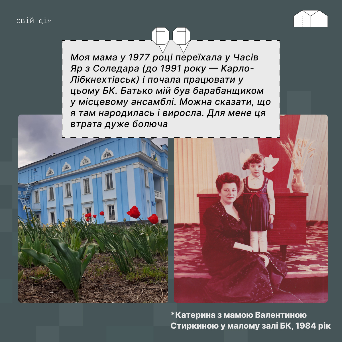 Пані Катерина виїхала з міста рік тому. Після звістки про знищення палацу культури досі не може оговтатись. З ним пов’язано все її життя.