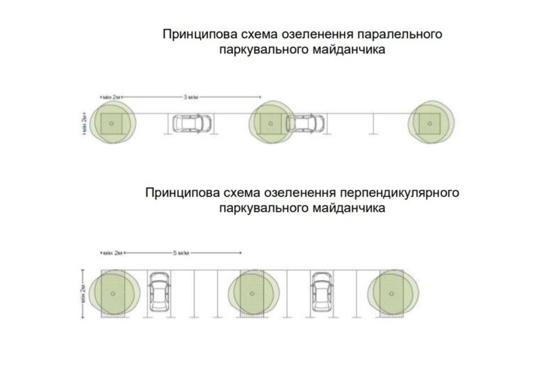 Так для перпендикулярного паркування рекомендують висаджувати не менше одного дерева на кожні п’ять машиномісць, а для паралельного – не менше одного дерева на кожні три машиномісця. При цьому дерева у дорослому віці повинні досягати не менше 15 метрів заввишки.