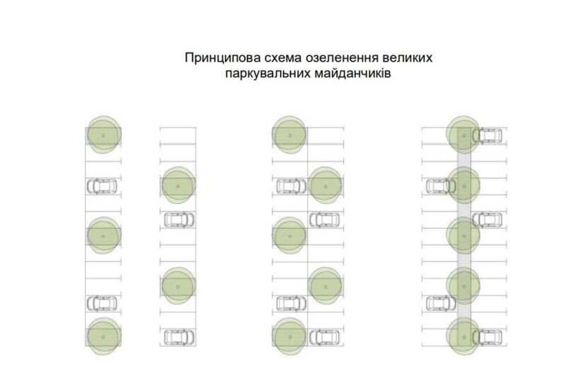 Також у рішенні виконкому є чіткі схеми розташування дерев для різних типів паркінгів, із врахуванням умов для здорового росту рослин — великих лунок для достатньої кількості води, повітря та простору для кореневої системи.