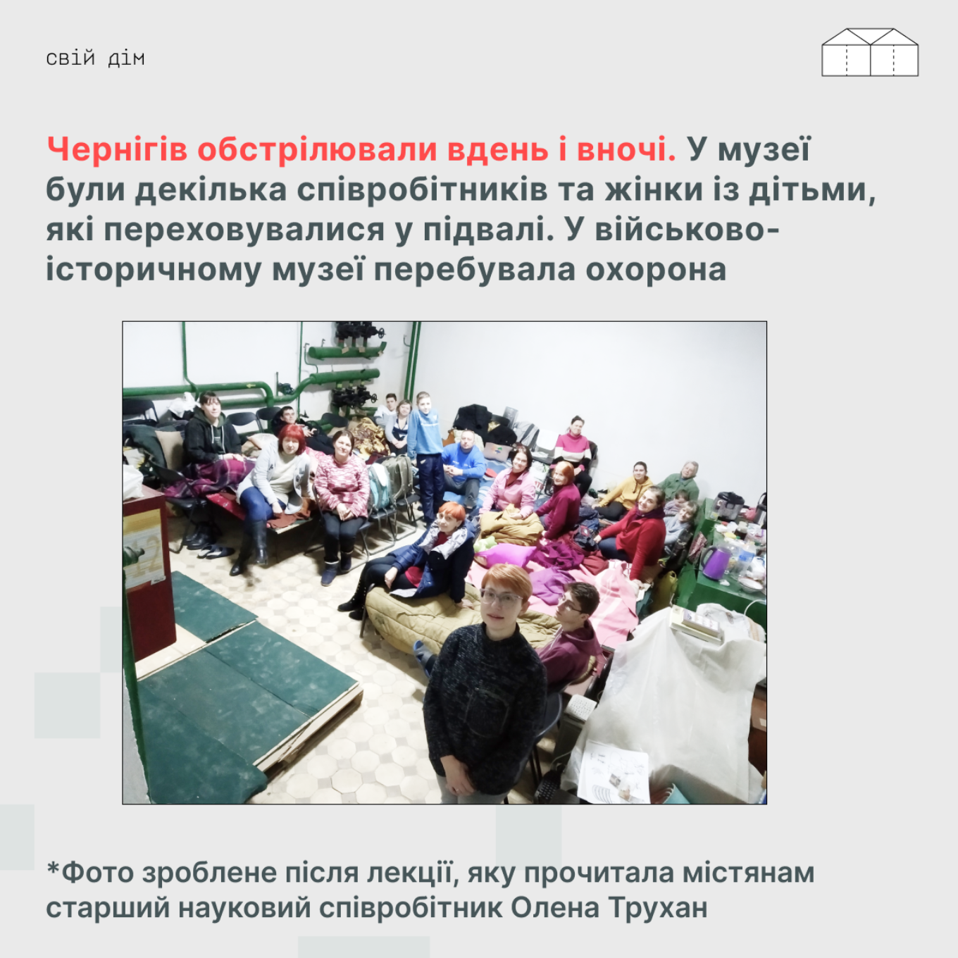 Протягом усієї облоги Чернігова музею, в якому переховувались місцеві, допомагали з ліками, продуктами харчування, засобами гігієни. Після звільнення міста – зі зберіганням музейних колекцій та необхідними матеріалами для господарсько-відновлювальних робіт. Зокрема, це генератори, кулери, розкладачки, OSB-плити, пакувальні матеріали, а також фінансова допомога співробітникам, які опинилися у скрутному становищі.
