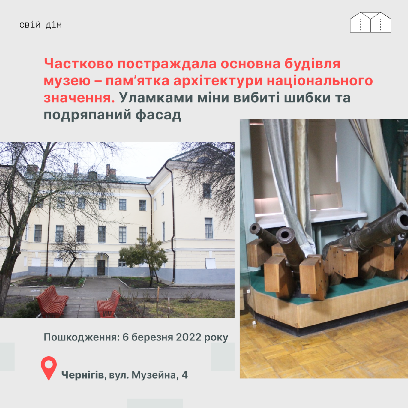“В одній із філій – військово-історичному музеї роботи з демонтажу експонатів І групи завершили у другій половині дня 24 лютого через загрозу ракетно-бомбових ударів. Після удару в ніч на 11 березня, музейна команда завершила демонтаж і переміщення найцінніших експонатів експозиції на першому поверсі у сховища”, – додає він.