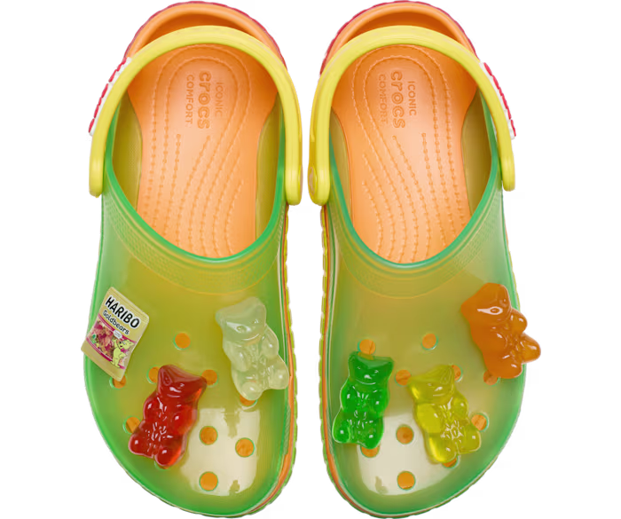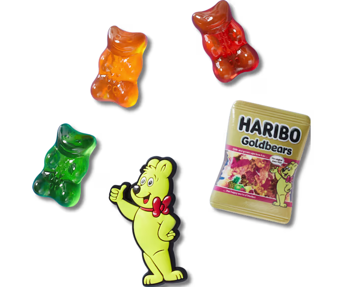 Прикрасити взуття можна наборами джибітсів (невеликі декоративні елементи для взуття типу “крокс”, – прим. ред.). У набір входить мініатюра золотої упаковки цукерок Haribo, желейні ведмедики різних кольорів та логотип бренду Haribo – ведмедик із червоним бантом.