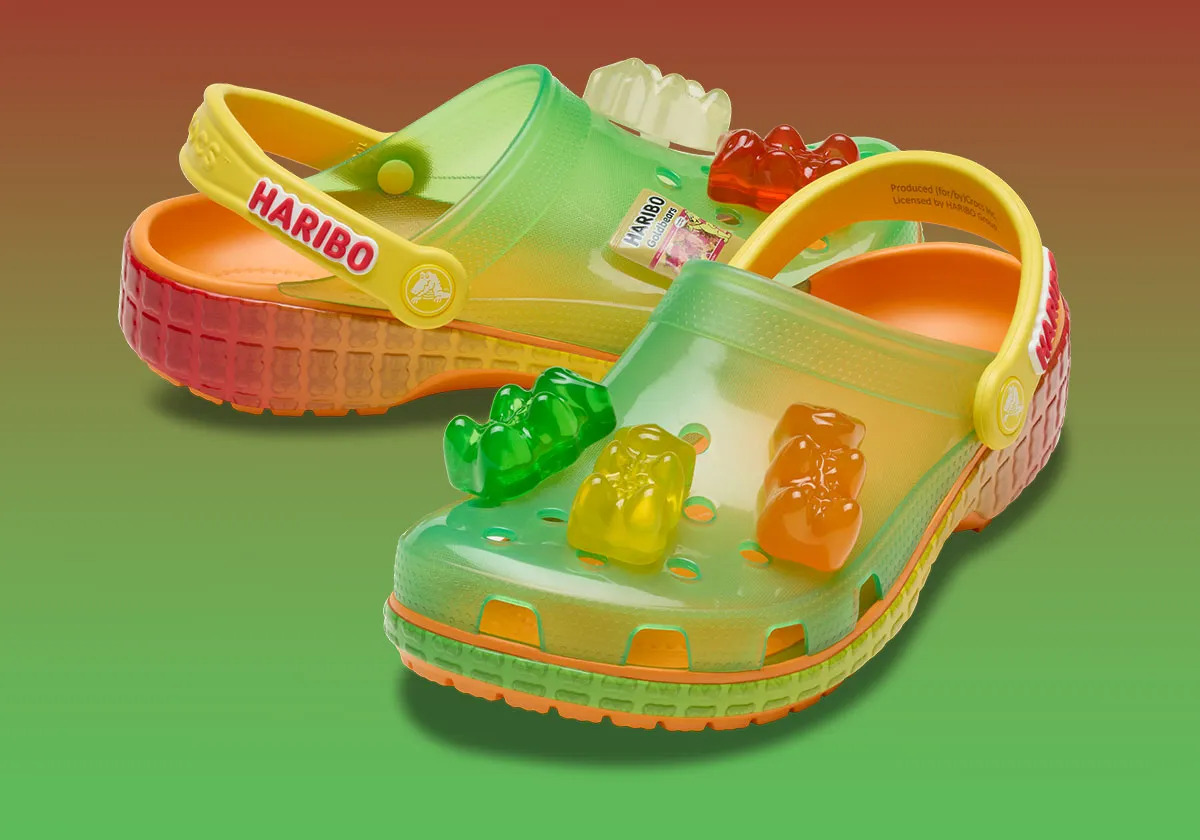 Прикрасити взуття можна наборами джибітсів (невеликі декоративні елементи для взуття типу “крокс”, – прим. ред.). У набір входить мініатюра золотої упаковки цукерок Haribo, желейні ведмедики різних кольорів та логотип бренду Haribo – ведмедик із червоним бантом.