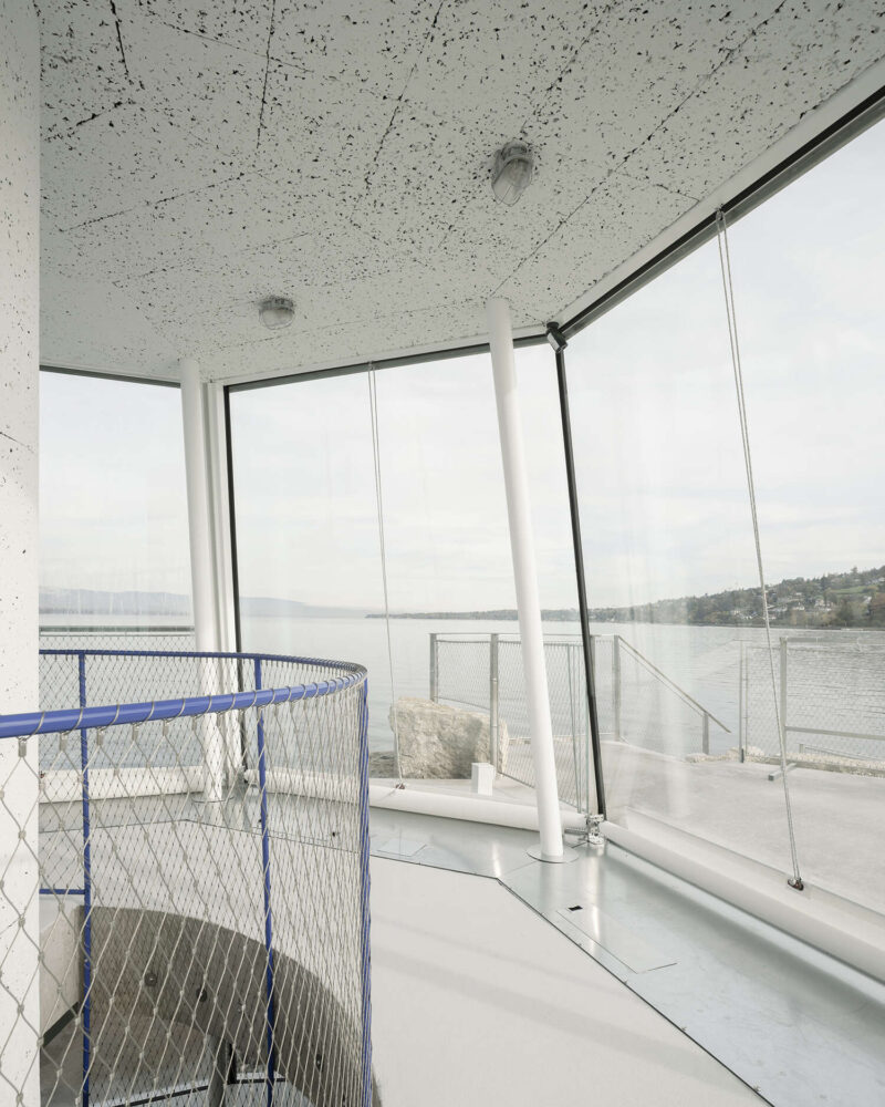 На відміну від класичних прибережних локацій із драматичними скелями чи відкритим рельєфом, набережна Женеви характеризується контрольованим і спокійним середовищем. Тому BUREAU свідомо підкреслює інфраструктурний характер споруди, а не відтворює знайомий силует традиційного маяка. Розташований серед кам’яного укріплення берега, об’єкт сприймається як частина цілісної системи гавані, а не як ізольований символ.