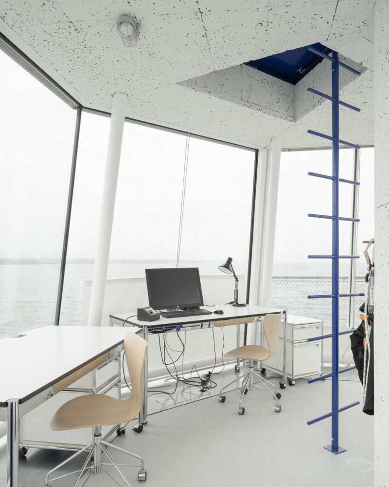 Проєкт також вибудовує нову просторову послідовність уздовж виходу в озеро. Внутрішня програма маяка розміщена на трьох рівнях. Нижній рівень — захищений простір із панорамним прорізом у бік води.