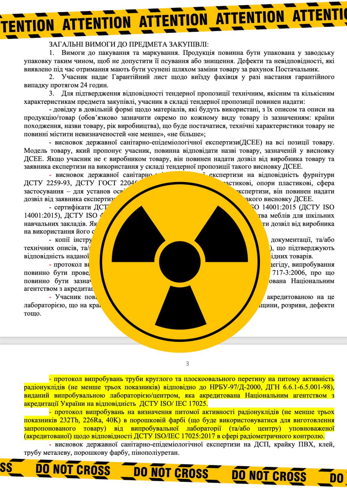 Згідно з документацією, планують закупити 2600 лав та 6200 стільців-трансформерів. Однак з однією вимогою – необхідно мати обов‘язковий сертифікат перевірки на радіонукліди Торій-232, Радій-226, Калій-40.