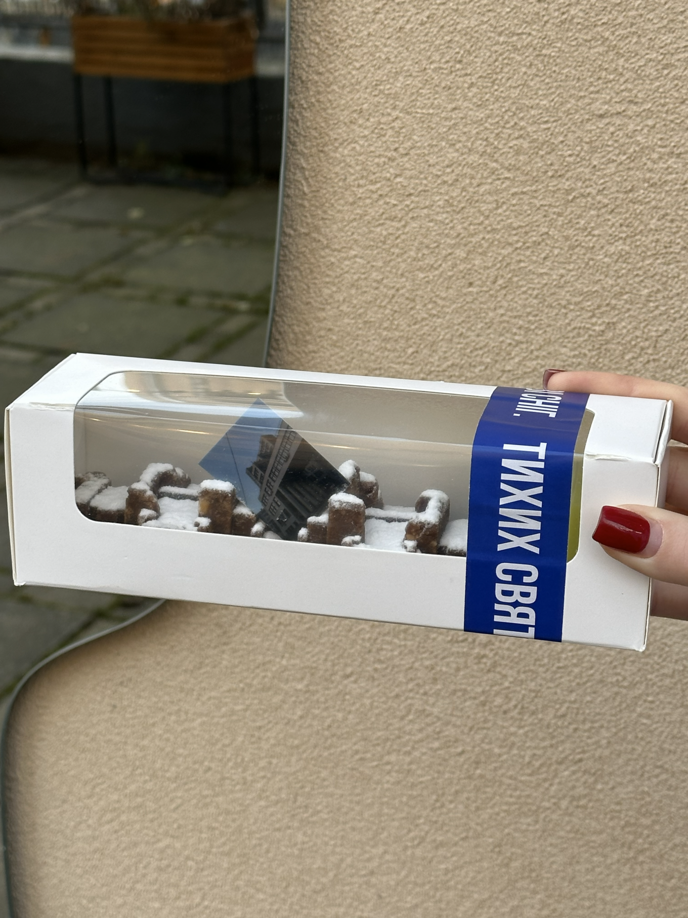 Разом із десертом гостям подають заламіновану фотографію будівлі Держпрому, зроблену харківською фотографкою Софією Панасюк.