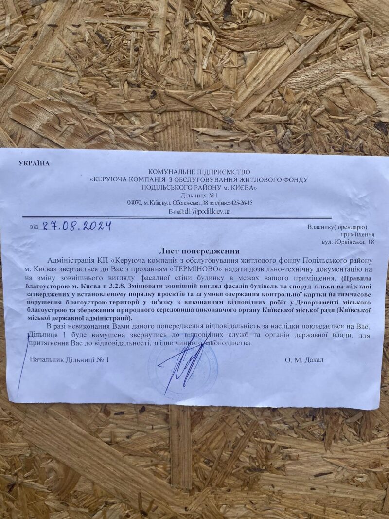 На звернення мешканців будинку відреагувала Керуюча компанія Подільського району. Вона винесла попередження власнику та спрямувала до відповідних органів офіційні звернення з проханням провести перевірку.