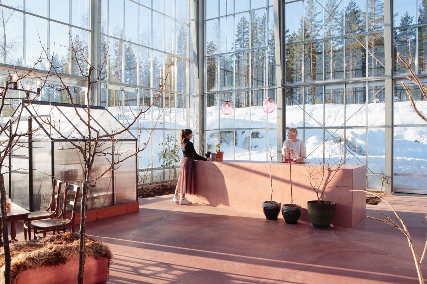 Сам дом вдохновлен традиционными норвежскими сараями, выкрашенными в красный цвет. С теплицей он сообщается через сдвижную стеклянную стену и пыльно-розовый глиняно-гипсовый пол по всему пространству. Стойку такого же цвета Маргит использует для мытья и подготовки овощей, а мини-теплицу внутри теплицы-дома — для укрытия молодых саженцев зимой.