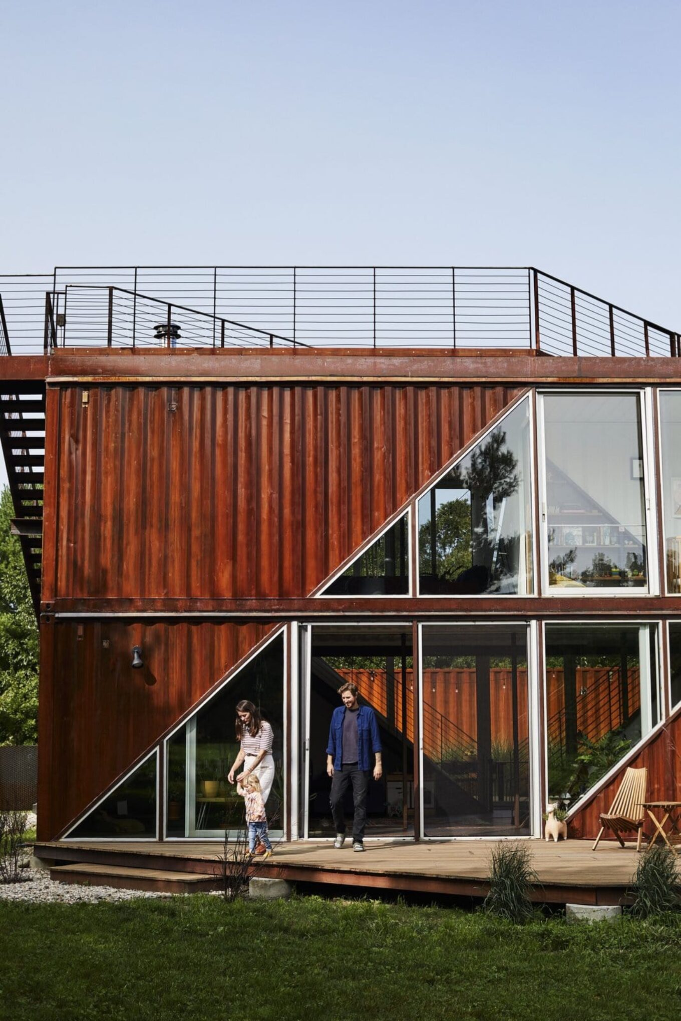 Чтобы соорудить этот двухэтажный дом для семьи с детьми рядом с Гудзоном, пионерам архитектуры из морских контейнеров студии LOT-EK понадобилось шесть подобных модулей из кортеновской стали. Особенно эффектно в нем смотрится диагональное остекление.