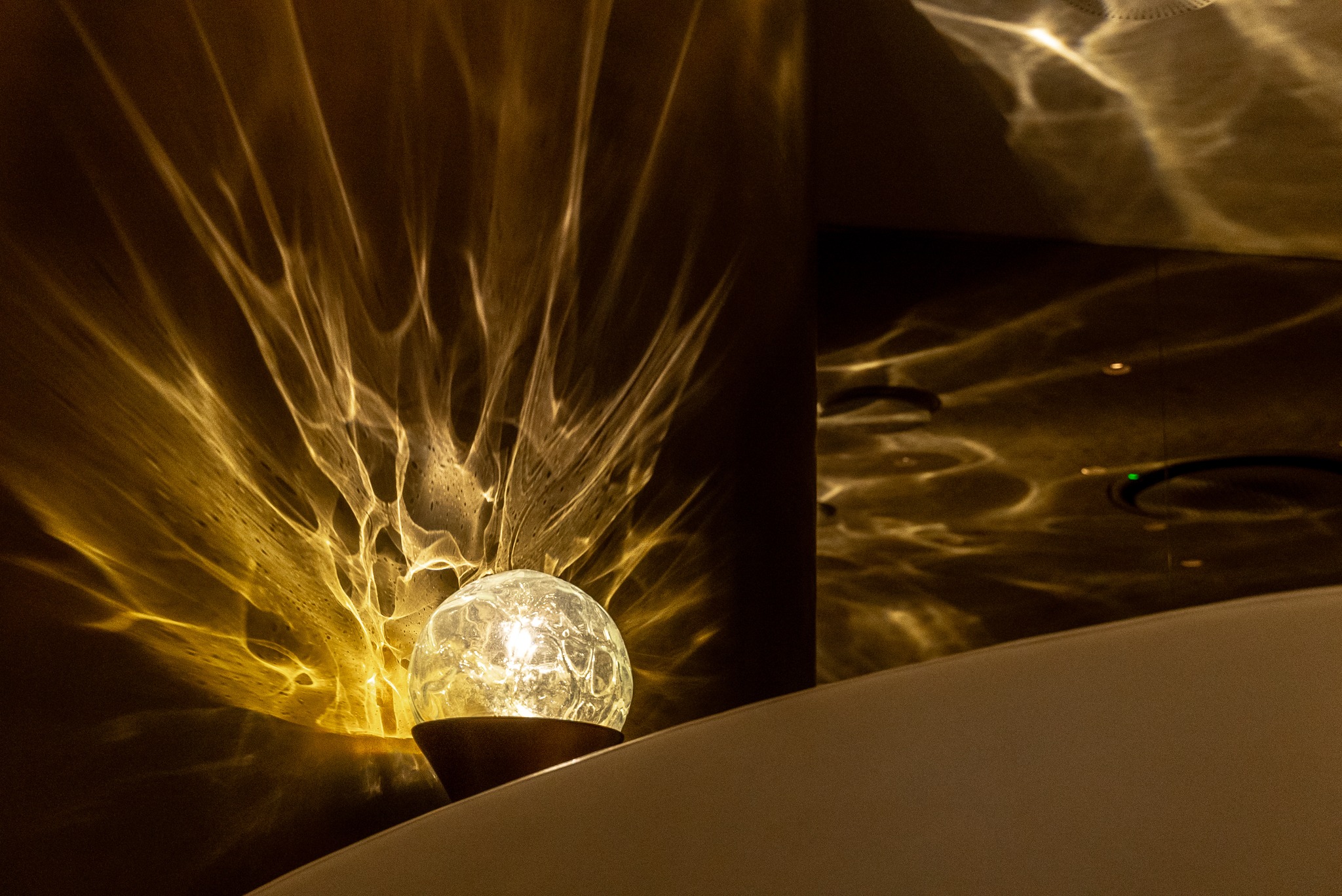 Саме на ній реалізували 3D-меппінг — світлову проєкцію, що перетворює стіну на динамічний артоб’єкт. Рух світла делікатно підкреслює природну фактуру матеріалу та додає інтер’єру глибини.