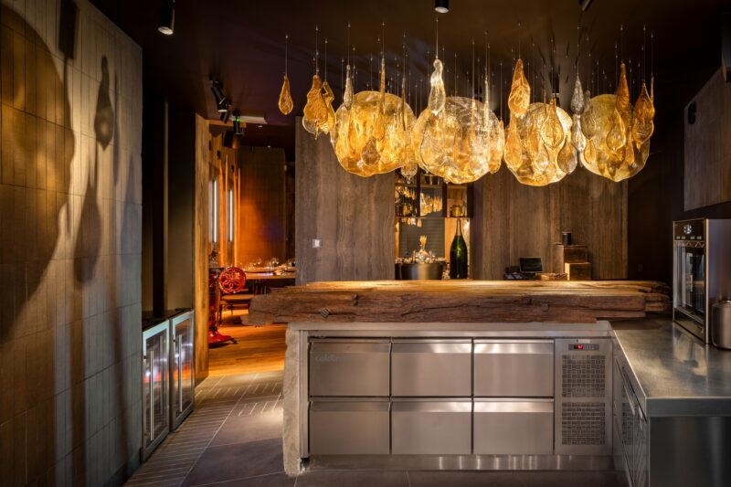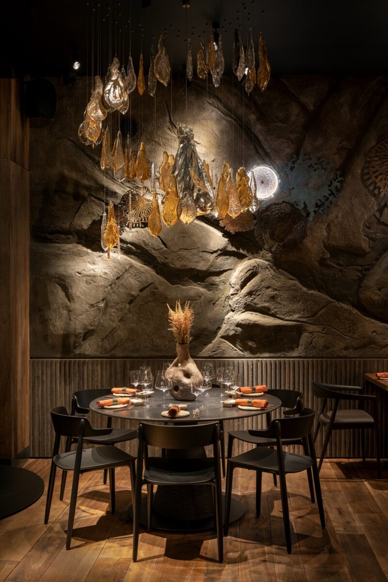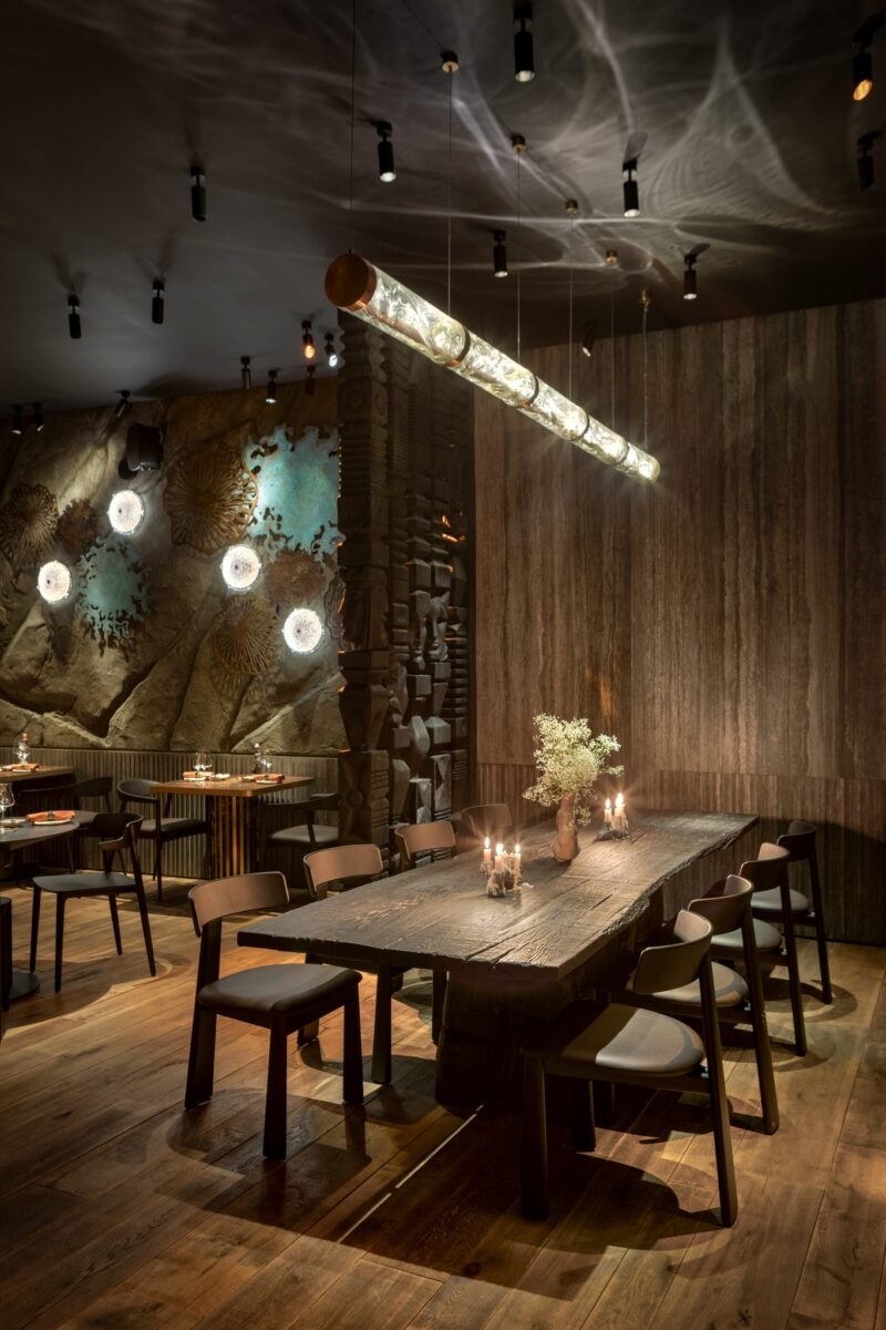 Для простору з містичною концепцією автори створили індивідуальну систему освітлення та унікальні кастомні артоб’єкти. Ключовими елементами інтер’єру стали дві авторські світло-скляні скульптури, виготовлені у склодувній майстерні Optical Metaphor.