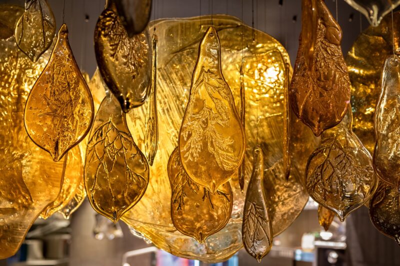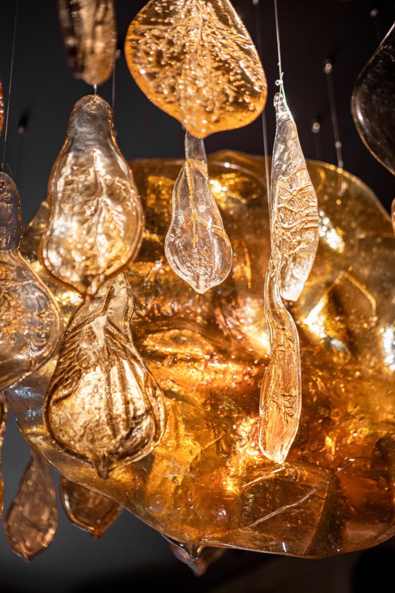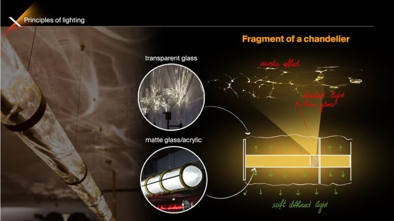 Як розповів світловий дизайнер, засновник та артдиректор компаній Expolight і Kabluka Light & Digital Sculptures Микола Каблука, центральним акцентом стала світло-скляна люстра, виконана у двох варіантах. Її образ побудований на символіці мольфара — поєднанні дзеркал як містичного елементу, вогню та рослинних мотивів. Дзеркальні фрагменти розташовані під різними кутами, створюючи багатошарові відбиття «вогняних» деталей. У янтарних відтінках та теплих переливах закладені текстури, що нагадують дим, полум’я та трави.